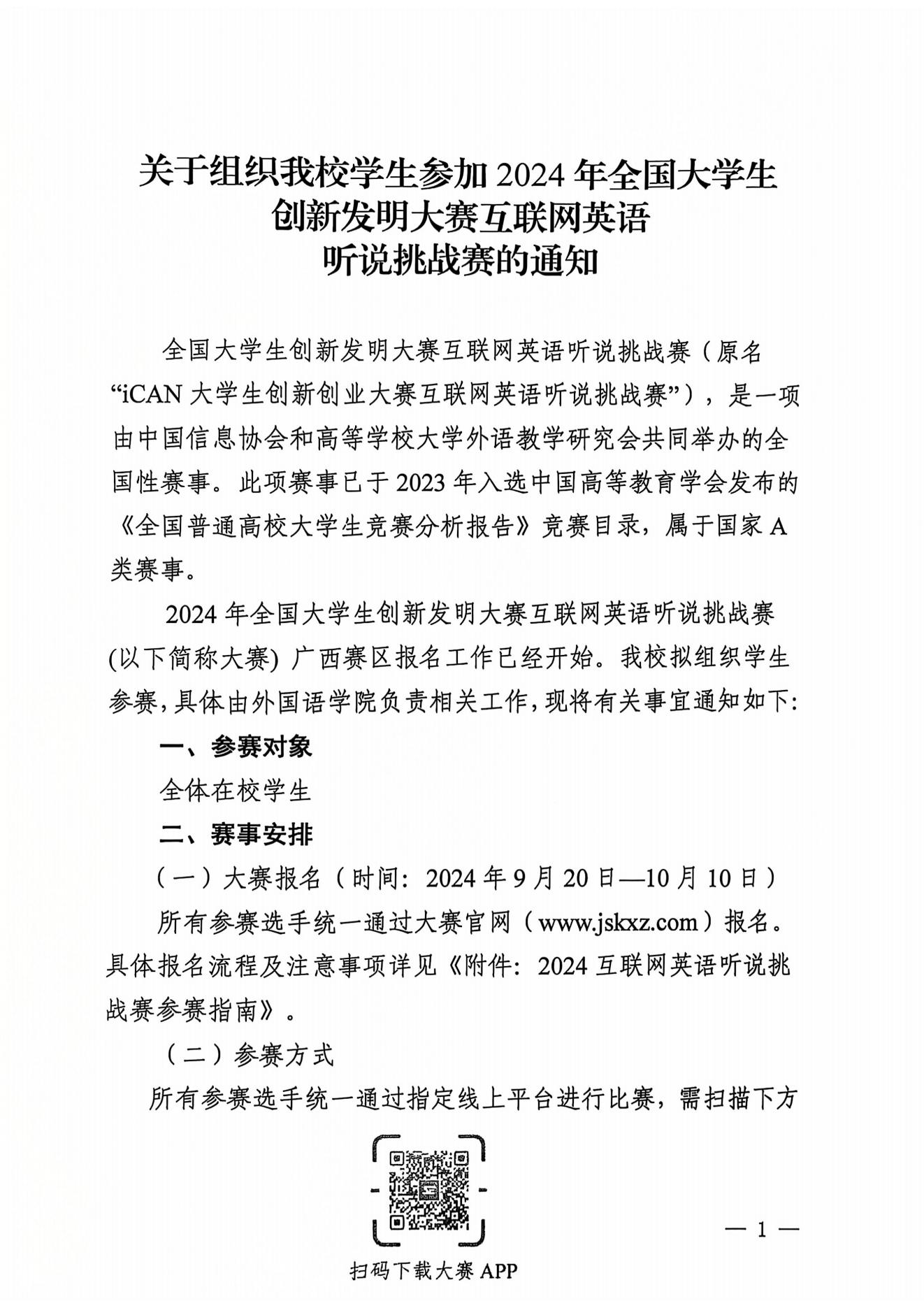 关于组织beat365学生参加2024年全国大学生创新发明大赛互联网英语听说挑战赛的通知 来源: 发布时间:2024-09-21 09:00:34 浏览次数: 次 【字体:小 大】 附件:《2024互联网英语听说挑战赛参赛指南》.pdf 分享到: 【打印正文】