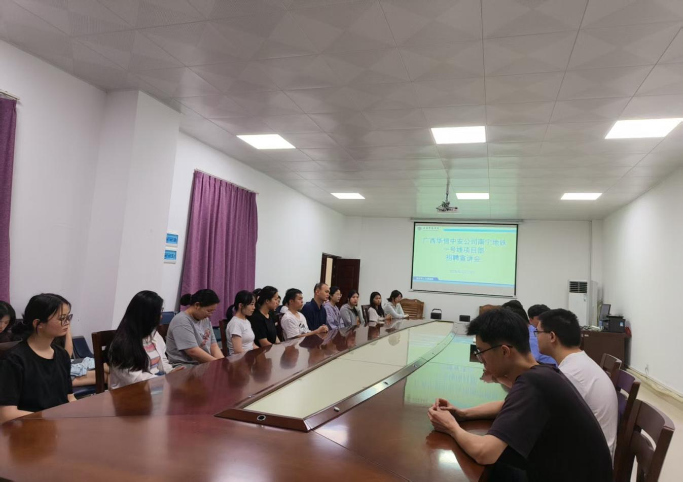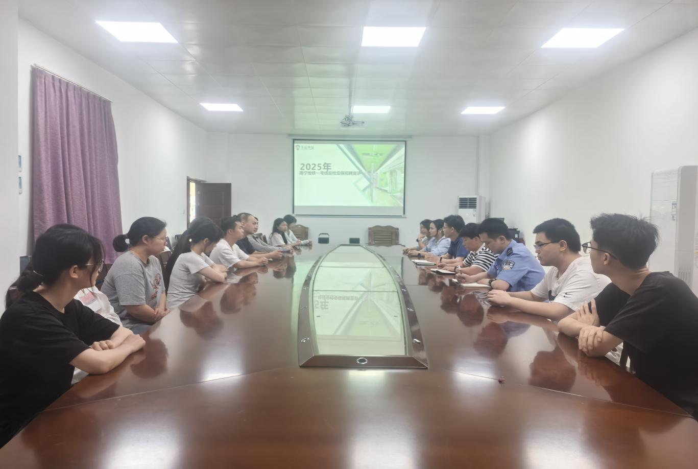 覃晓君介绍了公司南宁地铁一号线项目安检岗位设置、薪资待遇、发展前景、工作生活环境及招聘需求,公司曾招聘过的一批法学院的就业见习学生,对经过警务化管理的法学院学生具有很高的认可度,希望法学院的毕业生积极参加招聘。