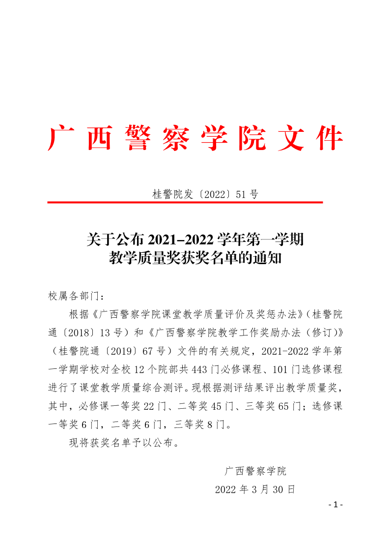 关于公布2021-2022学年第一学期教学质量奖获奖名单的通知