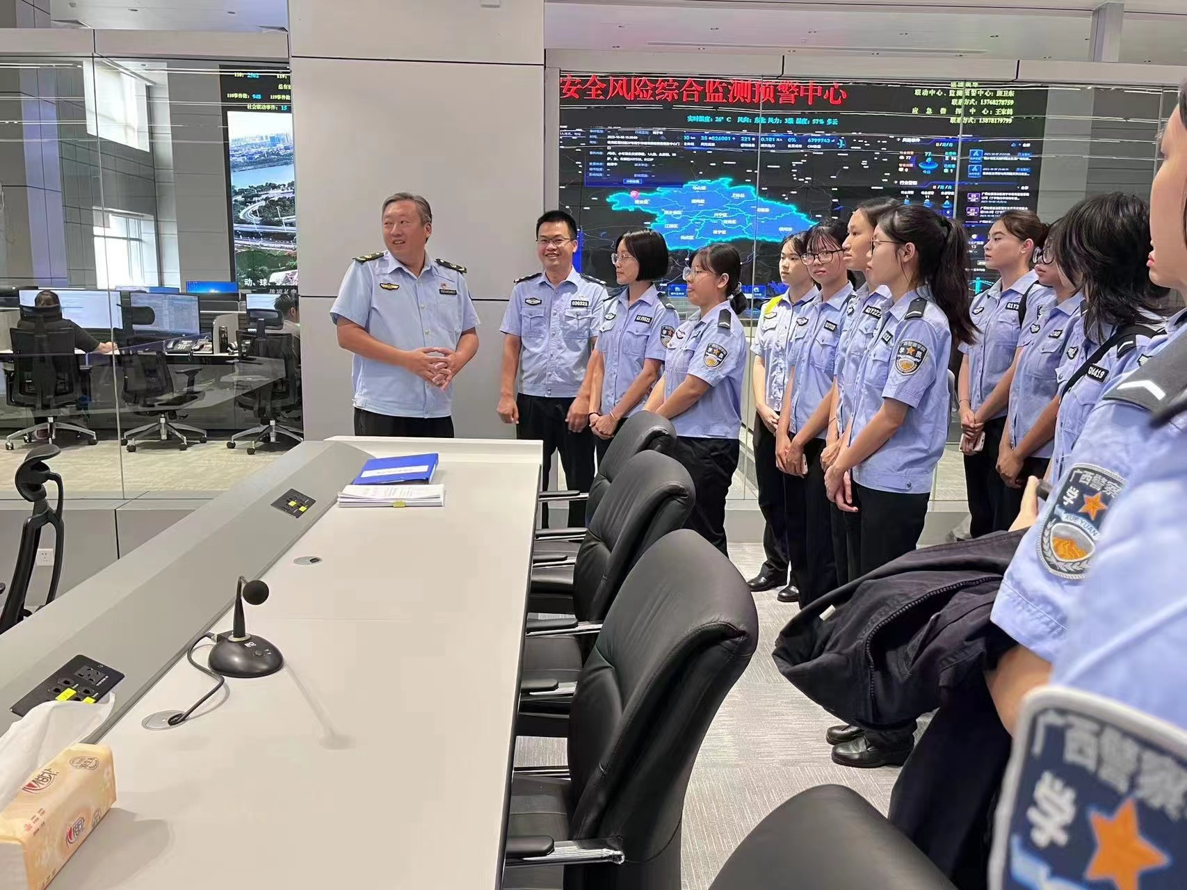随后大家来到城市安全风险综合监测预警大厅,南宁市城市应急联动中心副主任、党组成员班卫东对南宁市城市应急联动中心发展历程和现状的详细介绍。他通过应急联动系统、城市安全风险监测预警平台,为学生们展示了南宁市在城市安全风险防控和应急管理方面的先进做法。他深入讲解了城市安全风险、应急联动机制、应急管理能力、事件联动处置方法等情况。