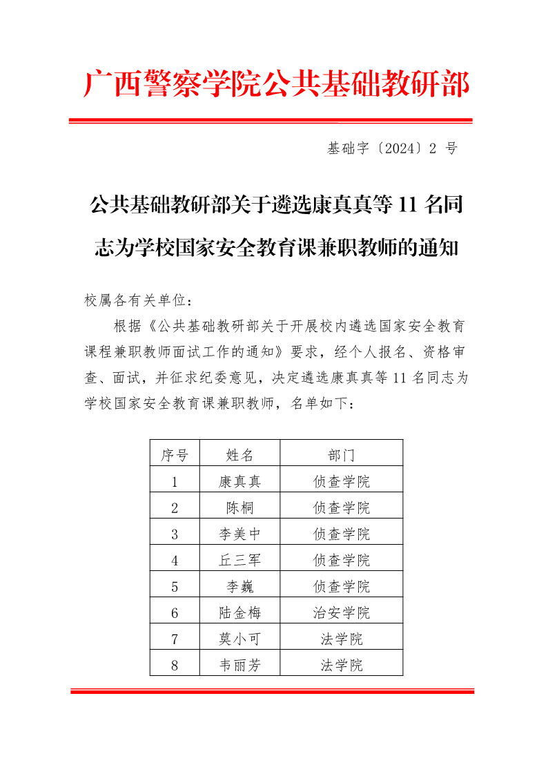 公共基础教研部关于遴选康真真等11名同志为国家安全教育课兼职教师的通知