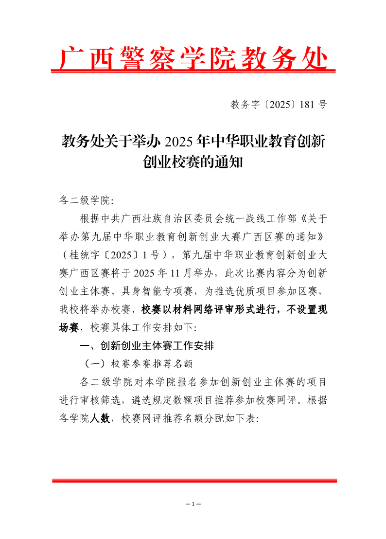 教务处关于举办2025年中华职业教育创新创业校赛的通知 来源: 发布时间:2025-10-17 18:40:14 浏览次数: 次 【字体:小 大】 附件1.关于举办第九届中华职业教育创新创业大赛广西区赛的通知.pdf附件2.第九届中华职业教育创新创业大赛广西区赛评审规则.docx附件3.项目评审书.docx附件4.2025年中华职业教育创新创业大赛beat365亚洲体育官方网站校赛推荐项目汇总表.xlsx附件5.第九届中华职业教育创新创业大赛广西赛区具身智能赛参赛材料.docx 分享到: 【打印正文】