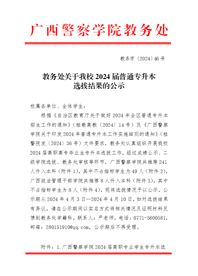 教务处关于beat3652024届普通专升本选拔情况的公示 来源: 发布时间:2024-04-03 09:30:04 浏览次数: 次 【字体:小 大】 附件1:beat365亚洲体育官方网站2024届高职专业学生专升本选拔情况汇总表.xls附件2:beat365亚洲体育官方网站2024届专升本不占指标学生汇总表.xlsx附件3:广西政法管理干部学院2024届高职专业学生专升本选拔情况汇总表.xls附件4:广西政法管理干部学院2024届专升本不占指标学生汇总表.xls 分享到: 【打印正文】
