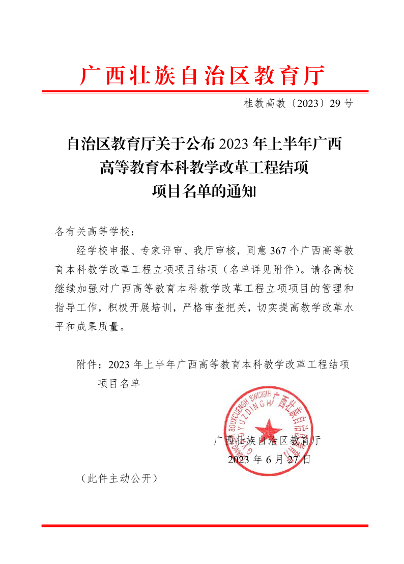 桂教高教〔2023〕29号自治区教育厅关于公布2023年上半年广西高等教育本科教学改革工程结项项目名单的通知 来源: 发布时间:2023-07-27 11:45:15 浏览次数: 次 【字体:小 大】 分享到: 【打印正文】