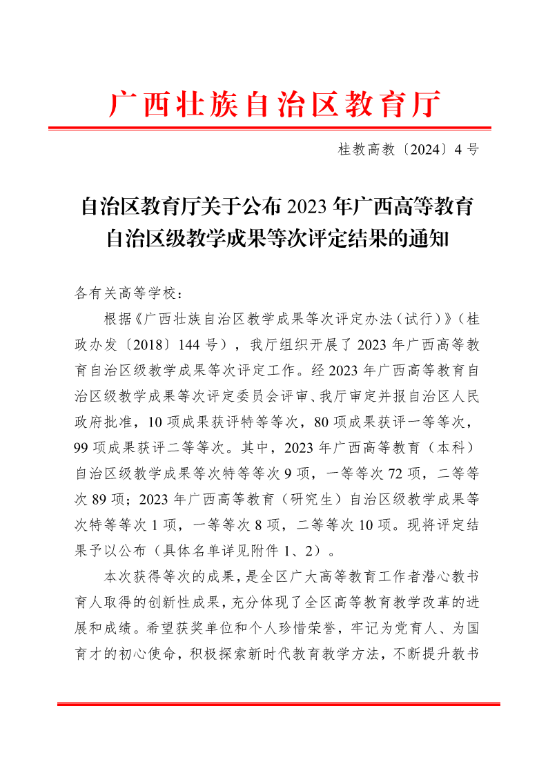 桂教高教〔2024〕4号自治区教育厅关于公布2023年广西高等教育自治区级教学成果等次评定结果的通知 来源: 发布时间:2024-02-25 11:55:16 浏览次数: 次 【字体:小 大】 分享到: 【打印正文】