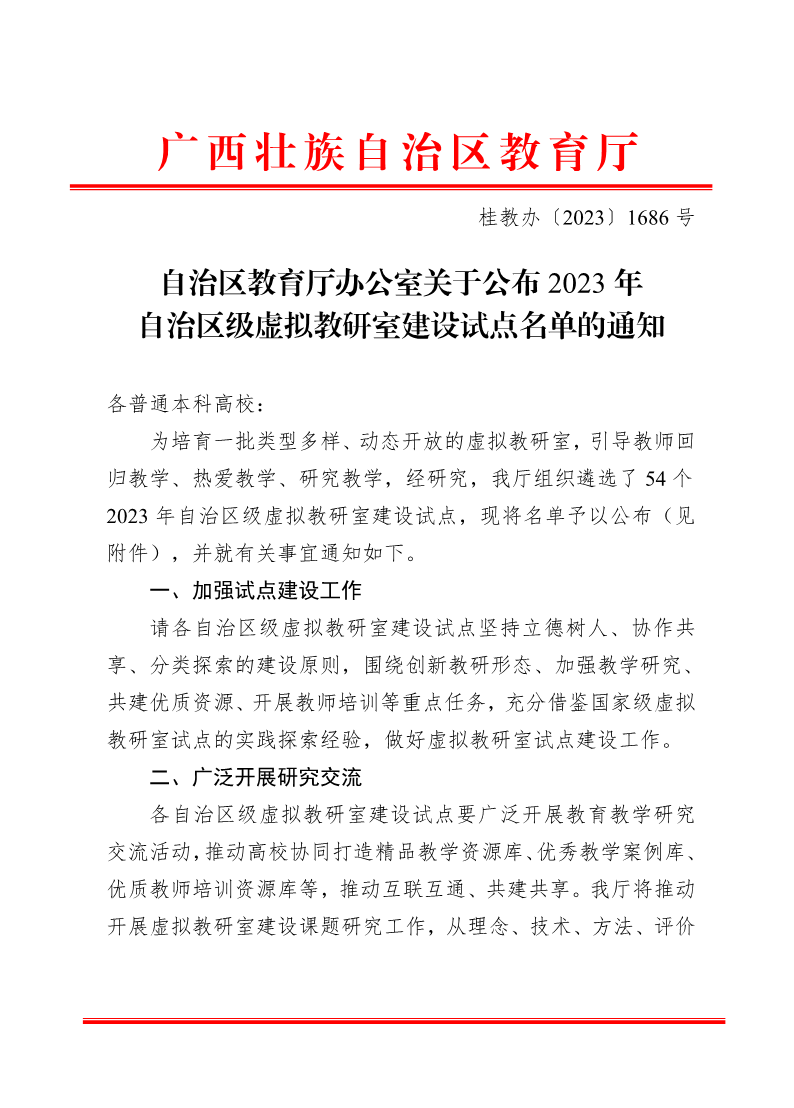 桂教办〔2023〕1686号自治区教育厅办公室关于公布2023年自治区级虚拟教研室建设试点名单的通知 来源: 发布时间:2024-01-10 11:57:08 浏览次数: 次 【字体:小 大】 分享到: 【打印正文】