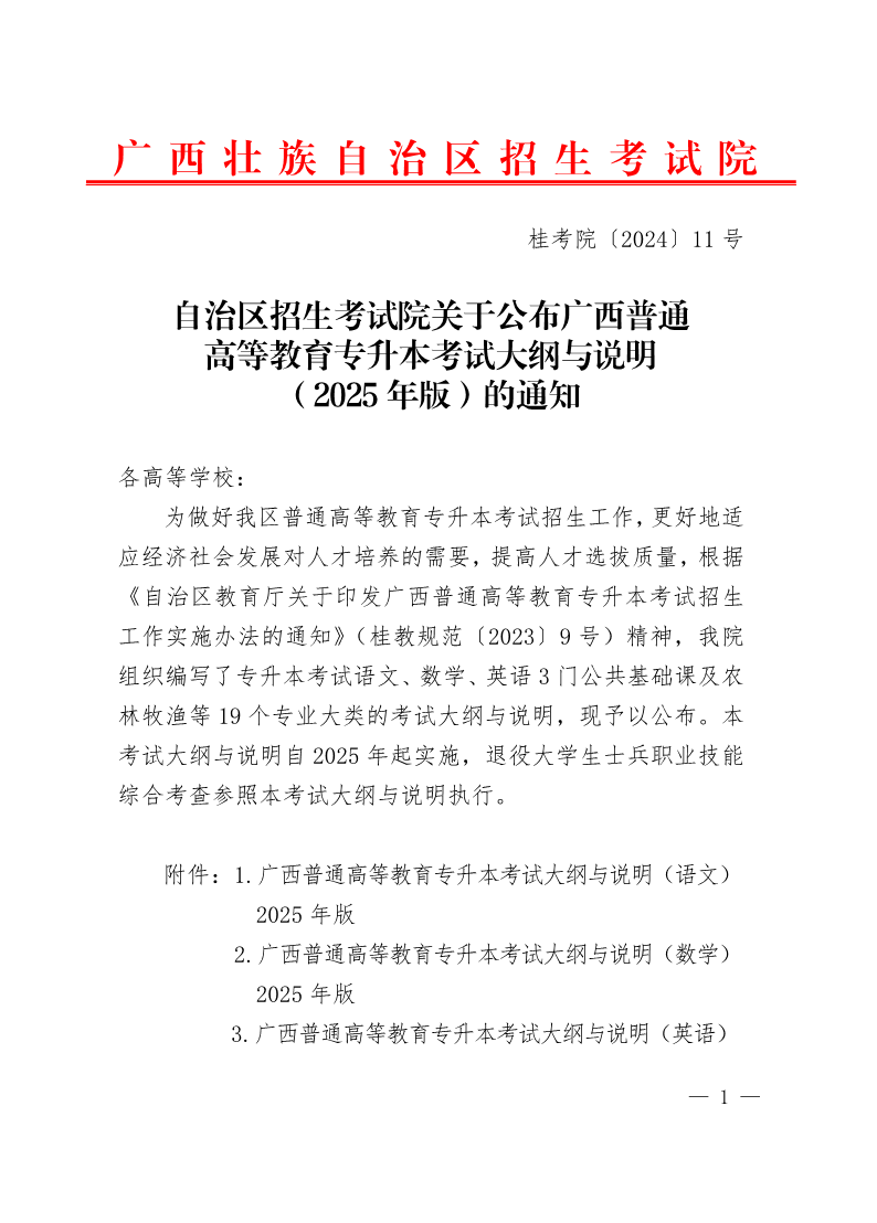 (桂考院 〔2024〕11号)自治区招生考试院关于公布广西普通高等教育专升本考试大纲与说明(2025年版)的通知 来源: 发布时间:2024-01-14 13:50:55 浏览次数: 次 【字体:小 大】 202401151757483039.pdf202401151757488076.pdf202401151757491703.pdf202401151757491523.pdf202401151757500962.pdf202401151757501247.pdf202401151757503081.pdf202401151757512582.pdf202401151757510037.pdf202401151757510671.pdf202401151757526735.pdf202401151757523272.pdf202401151757522620.pdf202401151757520381.pdf202401151757529487.pdf202401151757530730.pdf202401151757534722.pdf202401151757539873.pdf202401151757539325.pdf202401151757538551.pdf202401151757542830.pdf202401151757541674.pdf 分享到: 【打印正文】