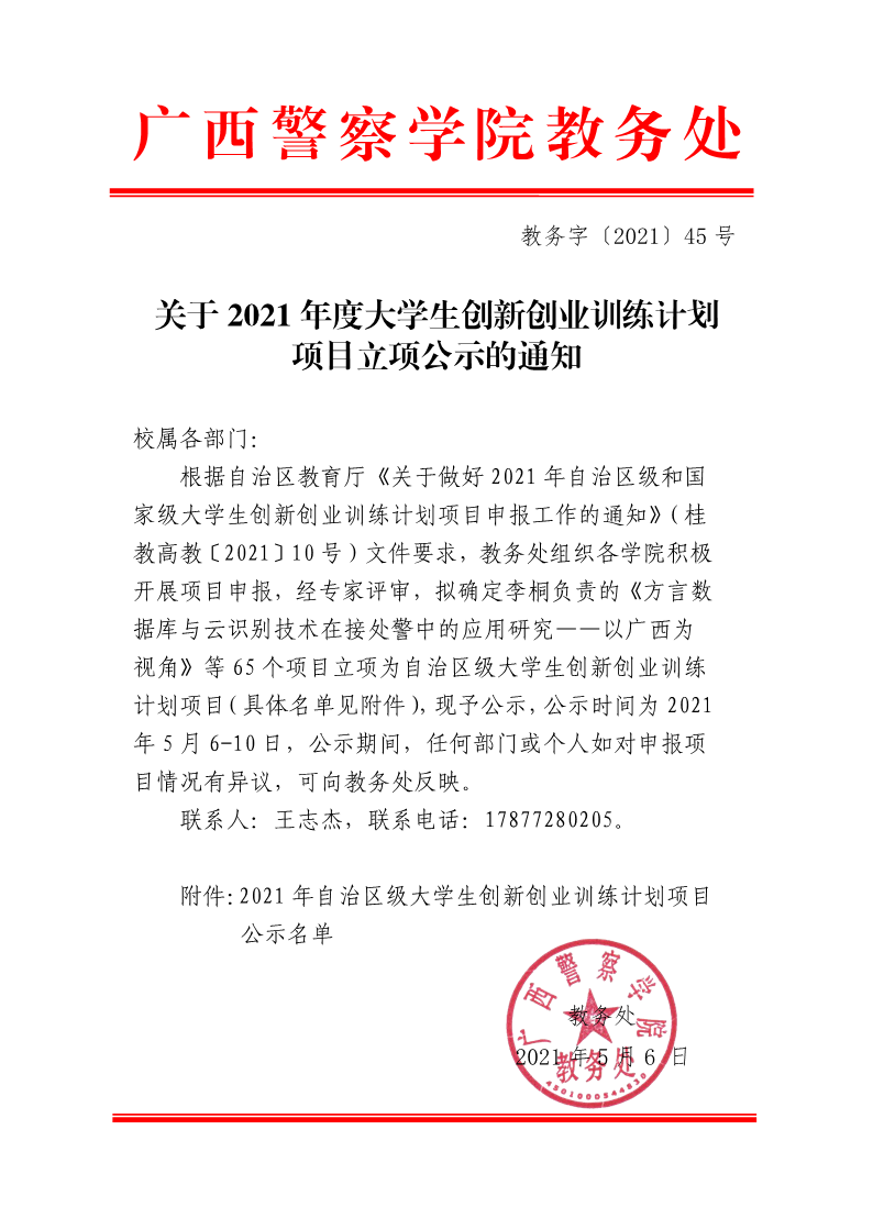关于2021年度大学生创新创业训练计划项目立项公示的通知