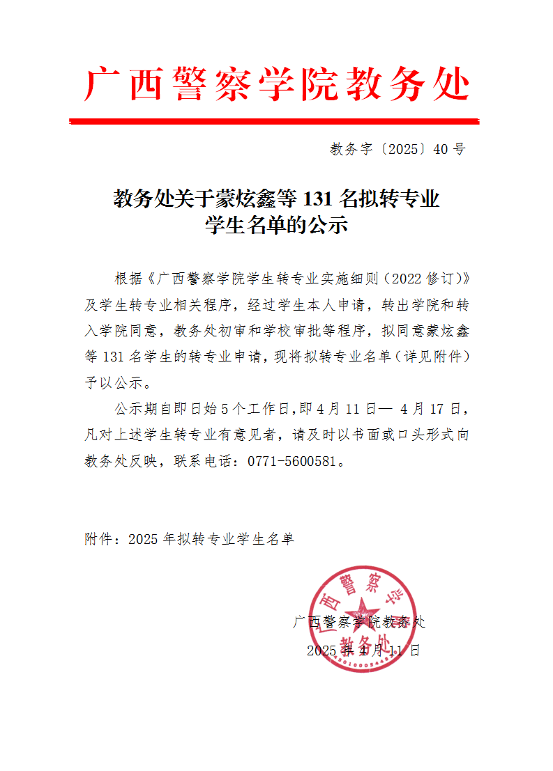 教务处关于蒙炫鑫等131名拟转专业学生名单的公示 来源: 发布时间:2025-04-14 16:59:19 浏览次数: 次 【字体:小 大】 附件:2025年拟转专业学生名单.xls 分享到: 【打印正文】