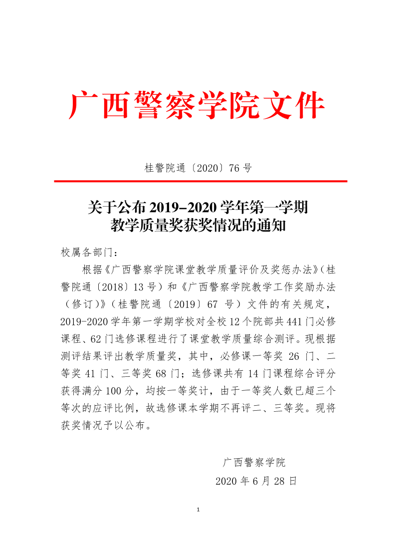 关于公布2019-2020学年第一学期教学质量奖获奖情况的通知