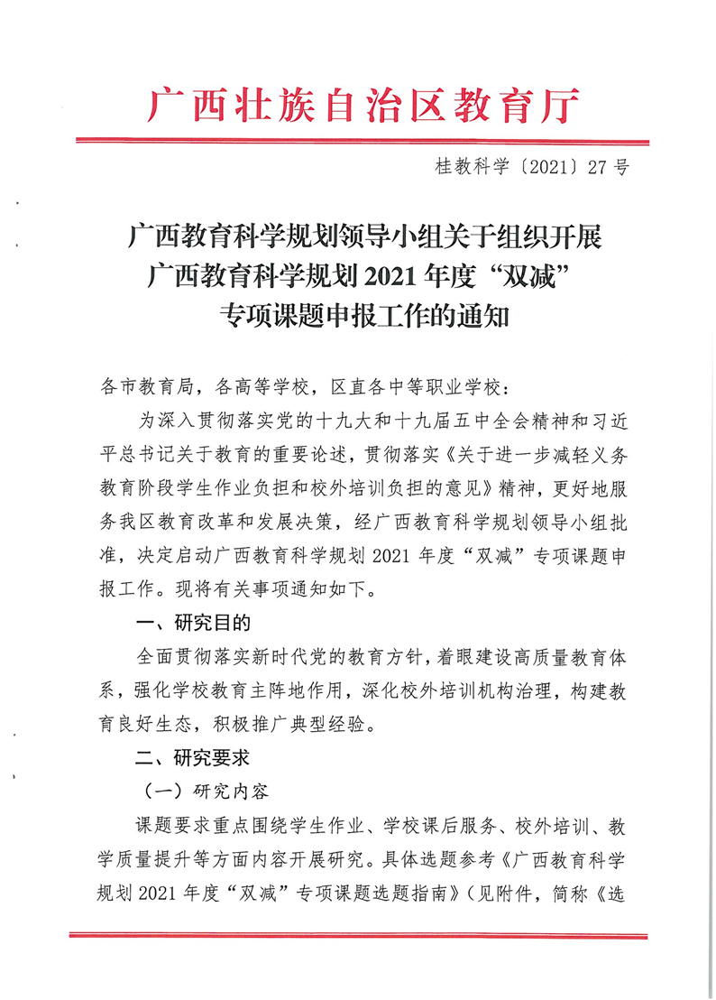 桂教科学〔2021〕27号 广西教育科学规划领导小组关于组织开展广西教育科学规划2021年度"双减"专项课题申报工作的通知 来源: 发布时间:2021-09-30 17:03:02 浏览次数: 次 【字体:小 大】 智能标签: 教育科学 规划 “双减 专项课题 分享到: 【打印正文】 相关内容