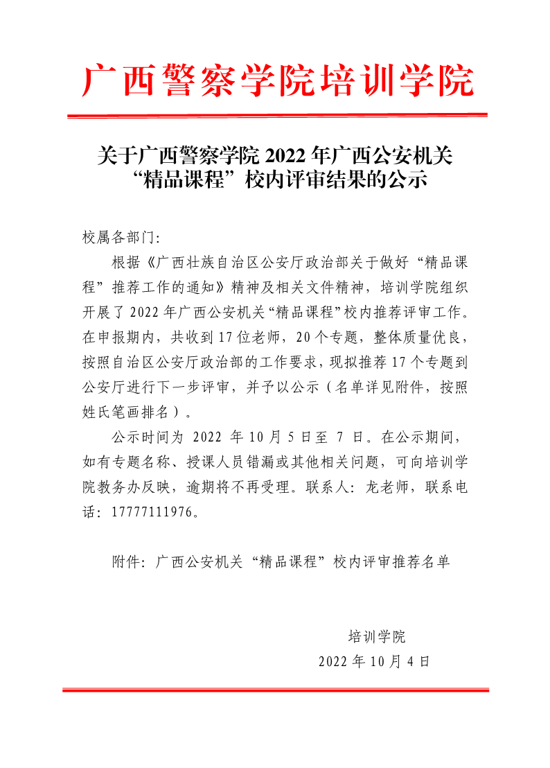关于beat365亚洲体育官方网站2022年广西公安机关 “精品课程”校内评审结果的公示 来源: 发布时间:2022-10-04 23:35:42 浏览次数: 次 【字体:小 大】 分享到: 【打印正文】
