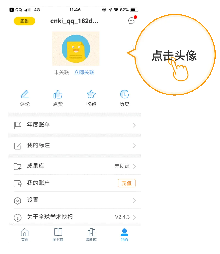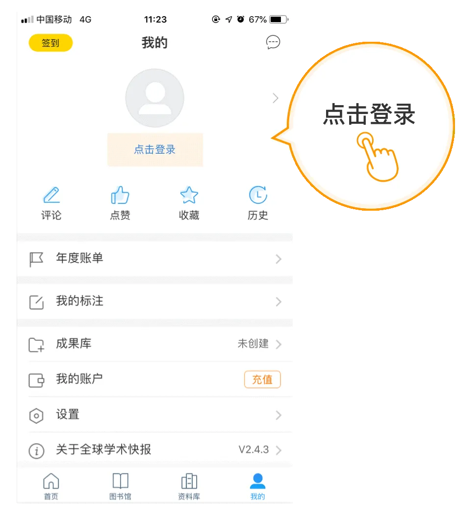 步骤3:用同一个账号登录“CAJ-云阅读”,在手机端打开全球学术快报,切换到底部的“资料库”界面,点击右上角—数据同步—即可把手机里的文献和PC端的CAJ云阅读实现数据同步。