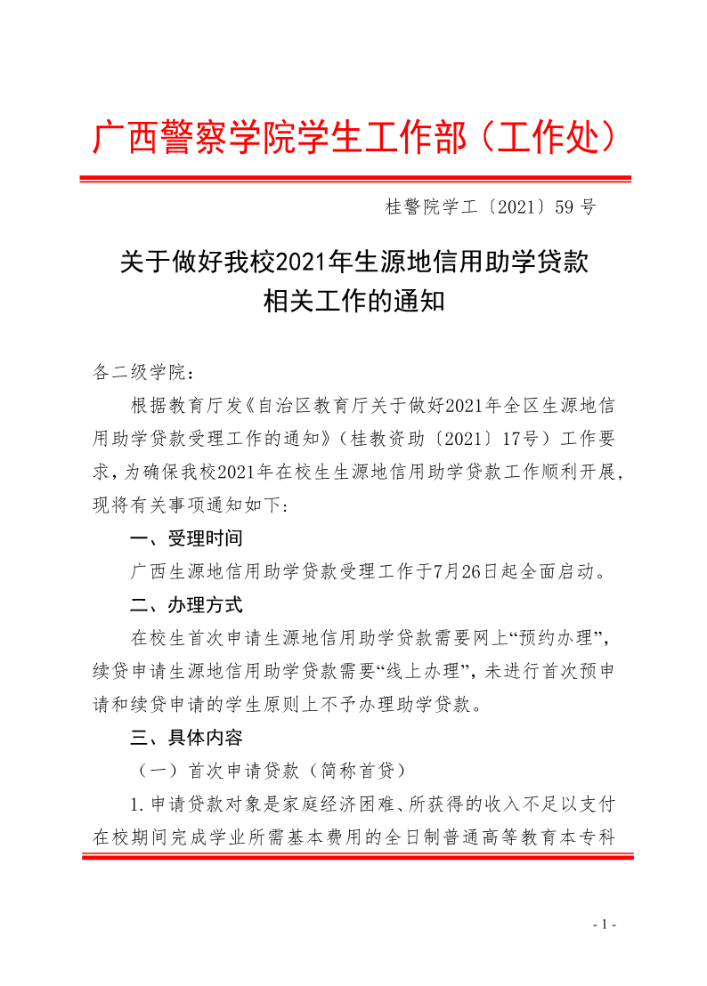 关于做好beat3652021年生源地信用助学贷款相关工作的通知 来源: 发布时间:2021-07-24 15:00:53 浏览次数: 次 【字体:小 大】 附件1:桂教资助〔2021〕17号自治区教育厅关于做好2021年全区生源地信用助学贷款受理工作的通知.pdf附件2:生源地助学贷款学生在线系统使用手册.pdf附件3:《家庭经济困难学生认定申请表》样表.pdf附件4:全区县(市、区)学生资助管理部门助学贷款首贷预约方式汇总表.pdf附件5:关于调整完善国家助学贷款有关政策的通知(教财【2020】4号).pdf 分享到: 【打印正文】