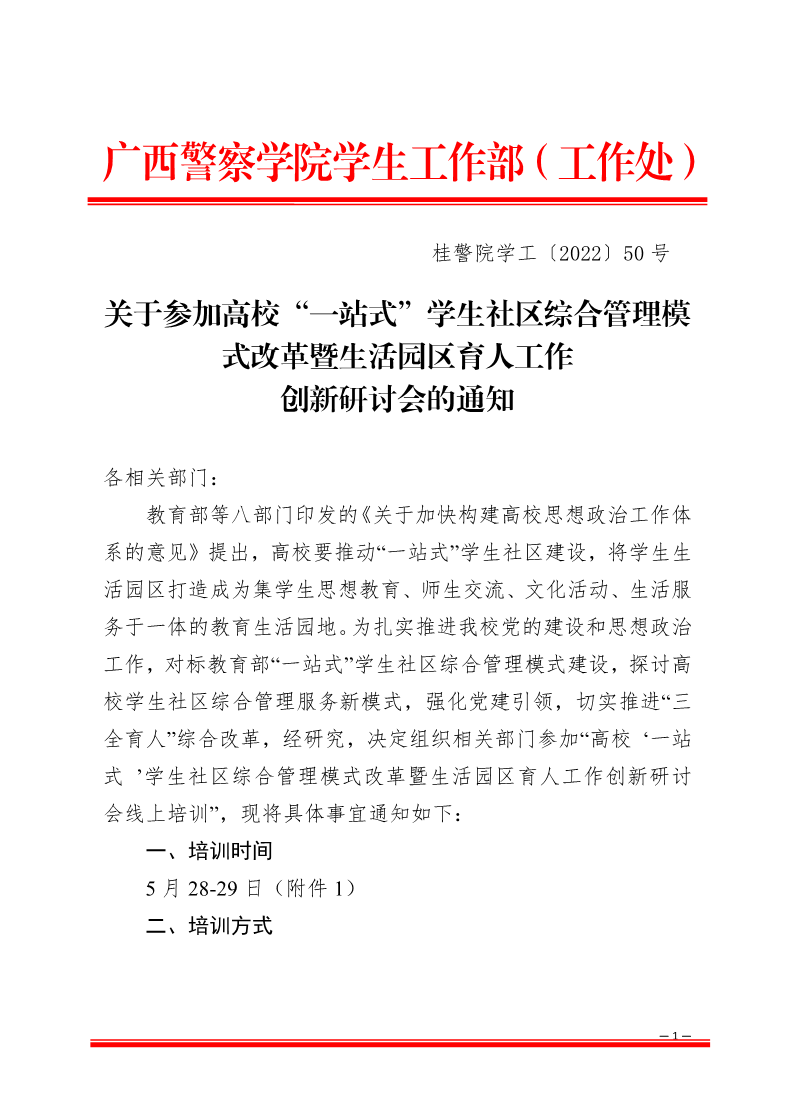 关于参加“高校 ‘一站式 ’学生社区综合管理模式改革暨生活园区育人工作创新研讨会的通知 来源: 发布时间:2022-05-26 10:15:45 浏览次数: 次 【字体:小 大】 分享到: 【打印正文】
