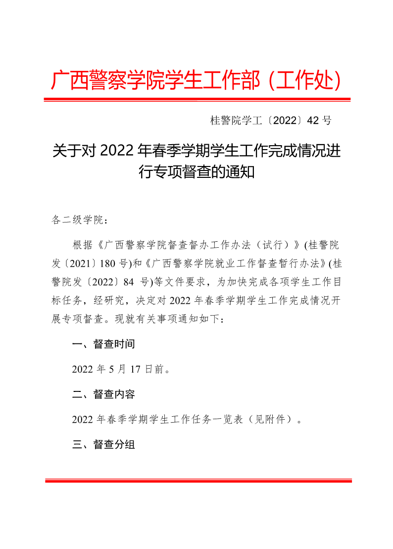 关于对2022年春季学期学生工作完成情况进行专项督查的通知 来源: 发布时间:2022-05-09 10:10:28 浏览次数: 次 【字体:小 大】 附件:2022年春季学期学生工作任务一览表.pdf 分享到: 【打印正文】