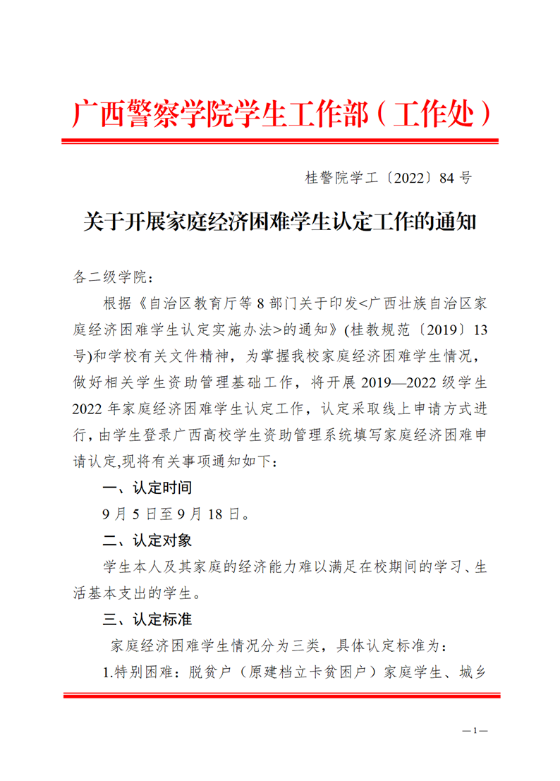 关于开展家庭经济困难学生认定工作的通知 来源: 发布时间:2022-09-04 11:00:42 浏览次数: 次 【字体:小 大】 附件1:广西高校学生资助管理系统学生线上申请认定操作流程.pdf附件2:广西高校学生资助管理系统辅导员审核操作流程.pdf附件3:广西高校学生资助管理系统二级学院审核操作流程.pdf附件4:2022年贫困生认定信息列表.pdf附件5:beat365亚洲体育官方网站2022年家庭经济困难学生认定民主评议记录表.pdf 分享到: 【打印正文】