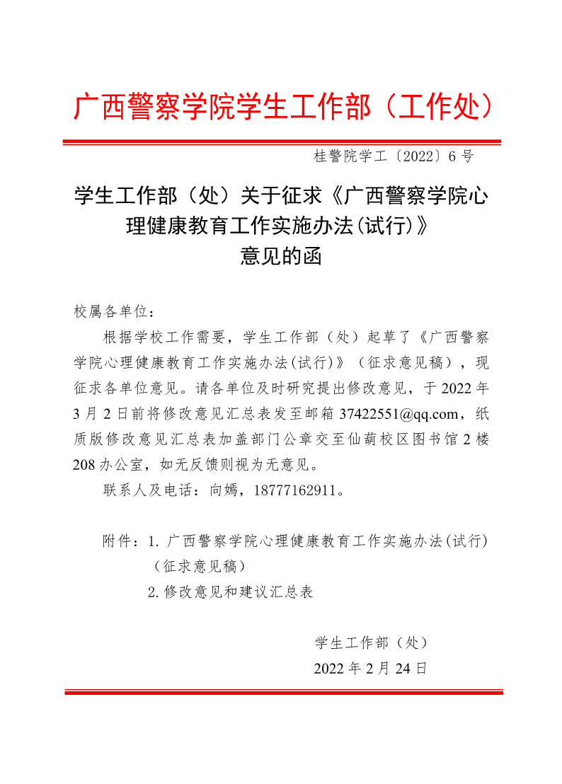 学生工作部(处)关于征求《beat365亚洲体育官方网站心理健康教育工作实施办法(试行)》意见的函 来源: 发布时间:2022-02-24 15:00:35 浏览次数: 次 【字体:小 大】 附件1:beat365亚洲体育官方网站心理健康教育工作实施办法(试行)(征求意见稿).pdf附件2:修改意见和建议汇总表.pdf 分享到: 【打印正文】