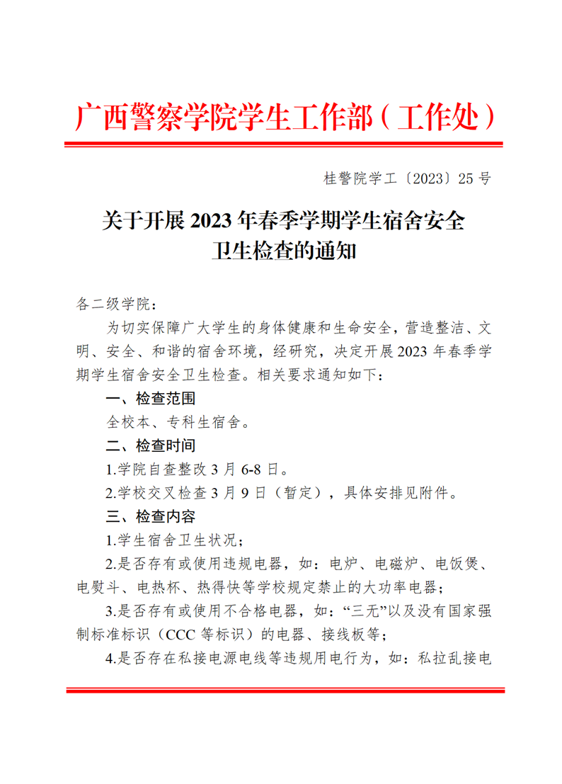 关于开展2023年春季学期学生宿舍安全卫生检查的通知 来源: 发布时间:2023-03-05 09:00:00 浏览次数: 次 【字体:小 大】 附件:2023年春季学期学生宿舍安全卫生交叉检查具体安排.pdf 分享到: 【打印正文】