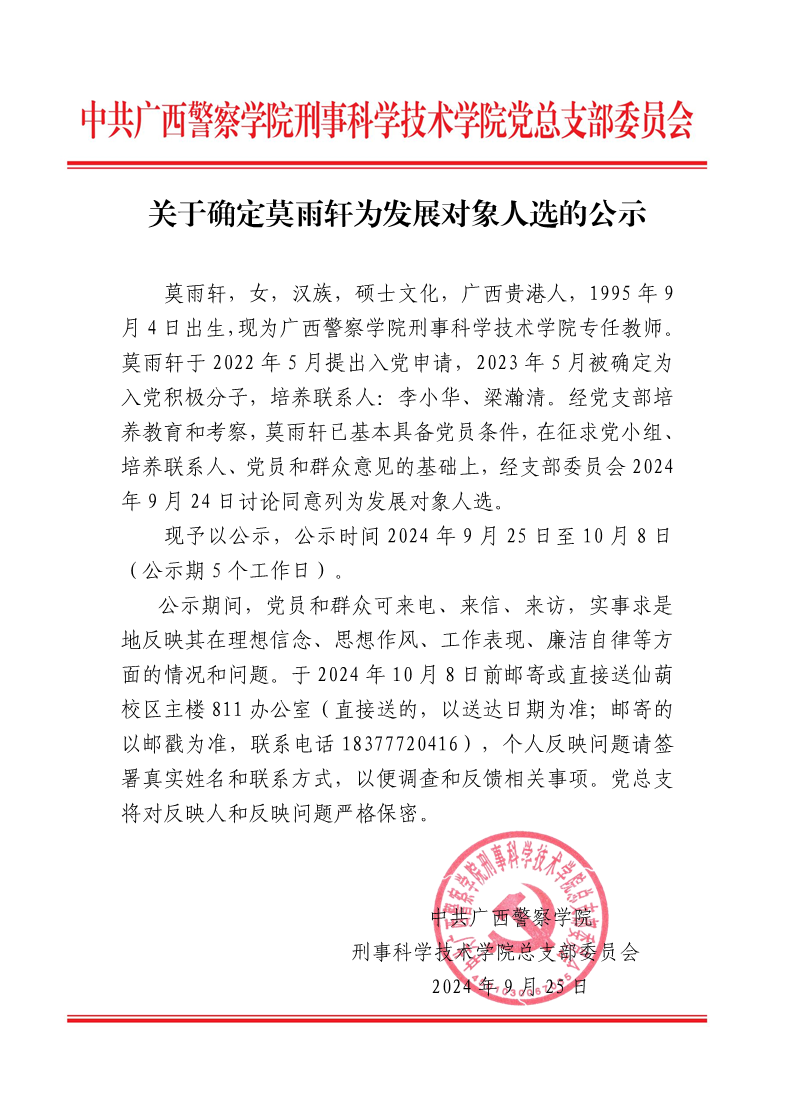 关于确定莫雨轩为发展对象人选的公示