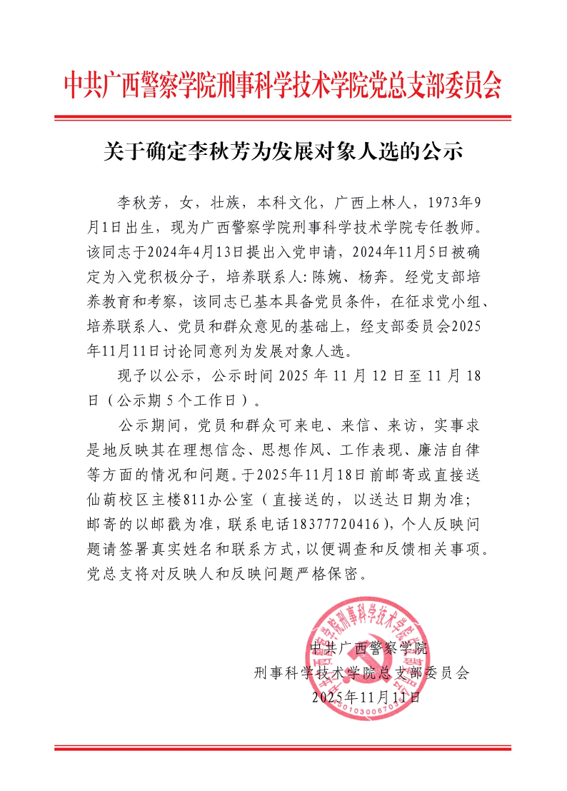 关于确定李秋芳同志为发展对象人选的公示