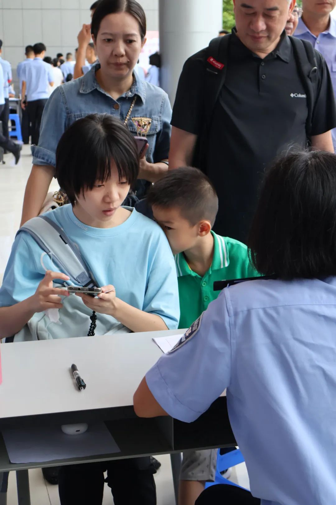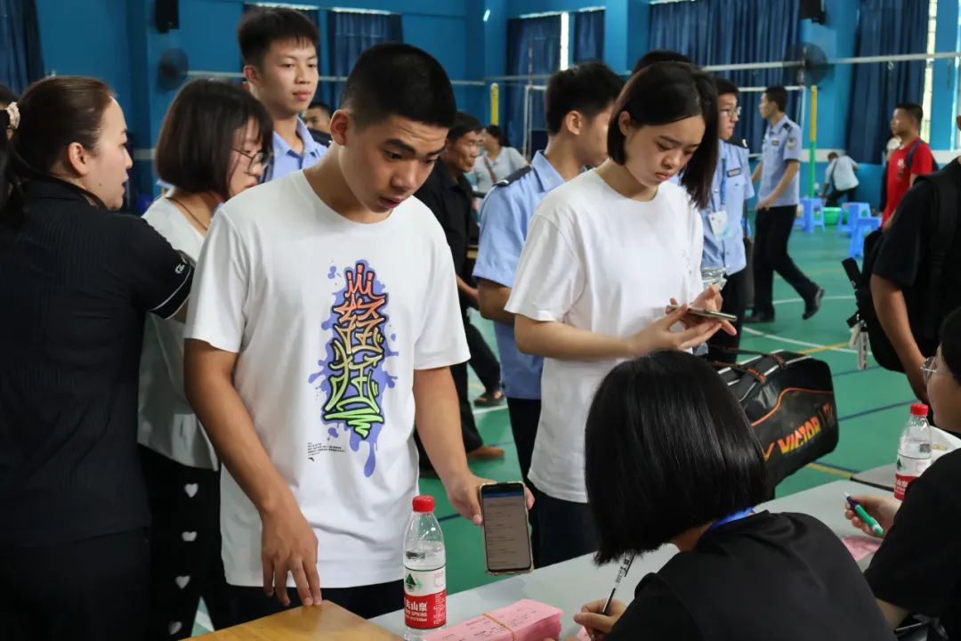 我院2023级新生在迎新工作现场有序地进行身份信息核对,确认无误后由学生志愿者们引领着前去办理入学后的一系列手续。