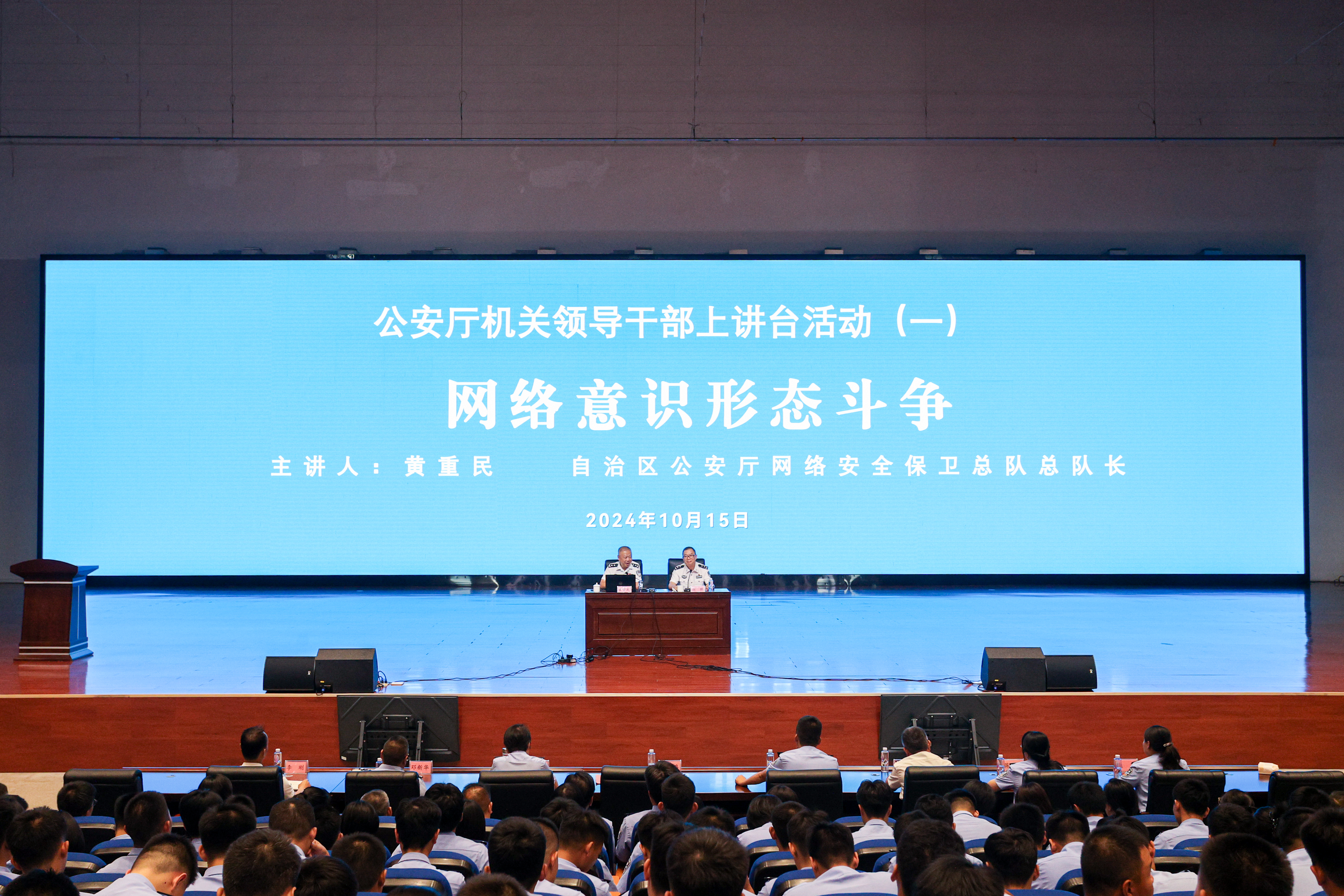 黄重民从我国网络意识形态安全面临的形势、网络意识形态风险的特点、风险防控策略等三个方面阐述了当前网络意识形态所面临的复杂形势,结合公安院校学生的特点提出了防范对策和建议,强调了网络安全工作在公安工作中的重要作用,勉励学警们在校期间努力学好网络安全相关专业知识,为今后从事公安工作打下坚实基础。