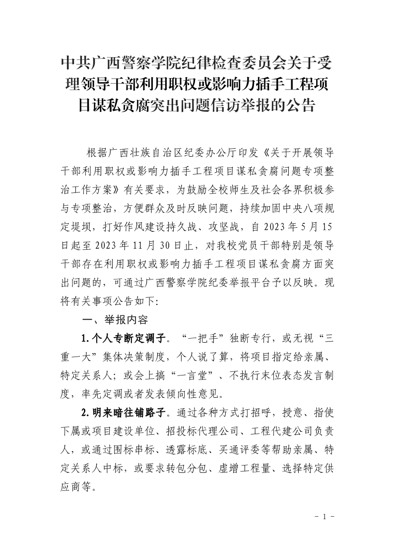 关于受理领导干部利用职权或影响力插手工程项目谋私贪腐突出问题的公告