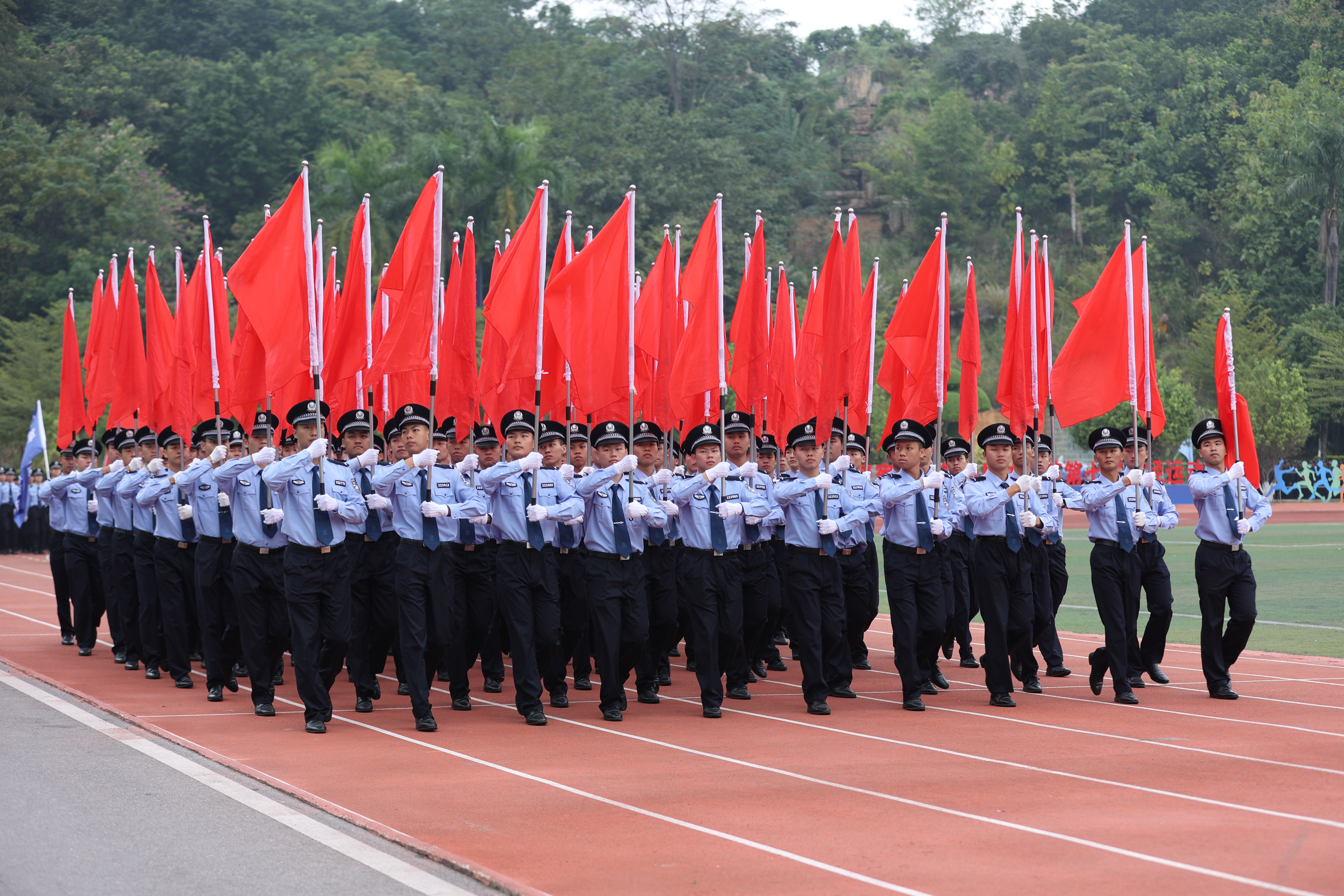 上午9时许,在激昂的乐曲声中,国旗护卫队、警旗警徽方队英姿飒爽、步履铿锵,护送庄严的五星红旗、警旗及警徽,昂首阔步朝主席台走来。紧随其后的是运动会标识护卫队、红旗方队、教官团分列方队、裁判员代表和各学院特色展示方阵。冒着秋雨,各方阵怀着饱满的热情、昂扬的斗志,喊出的口号响彻体育场上空,尽显警院学子的坚毅与不畏困难的良好精神风貌。