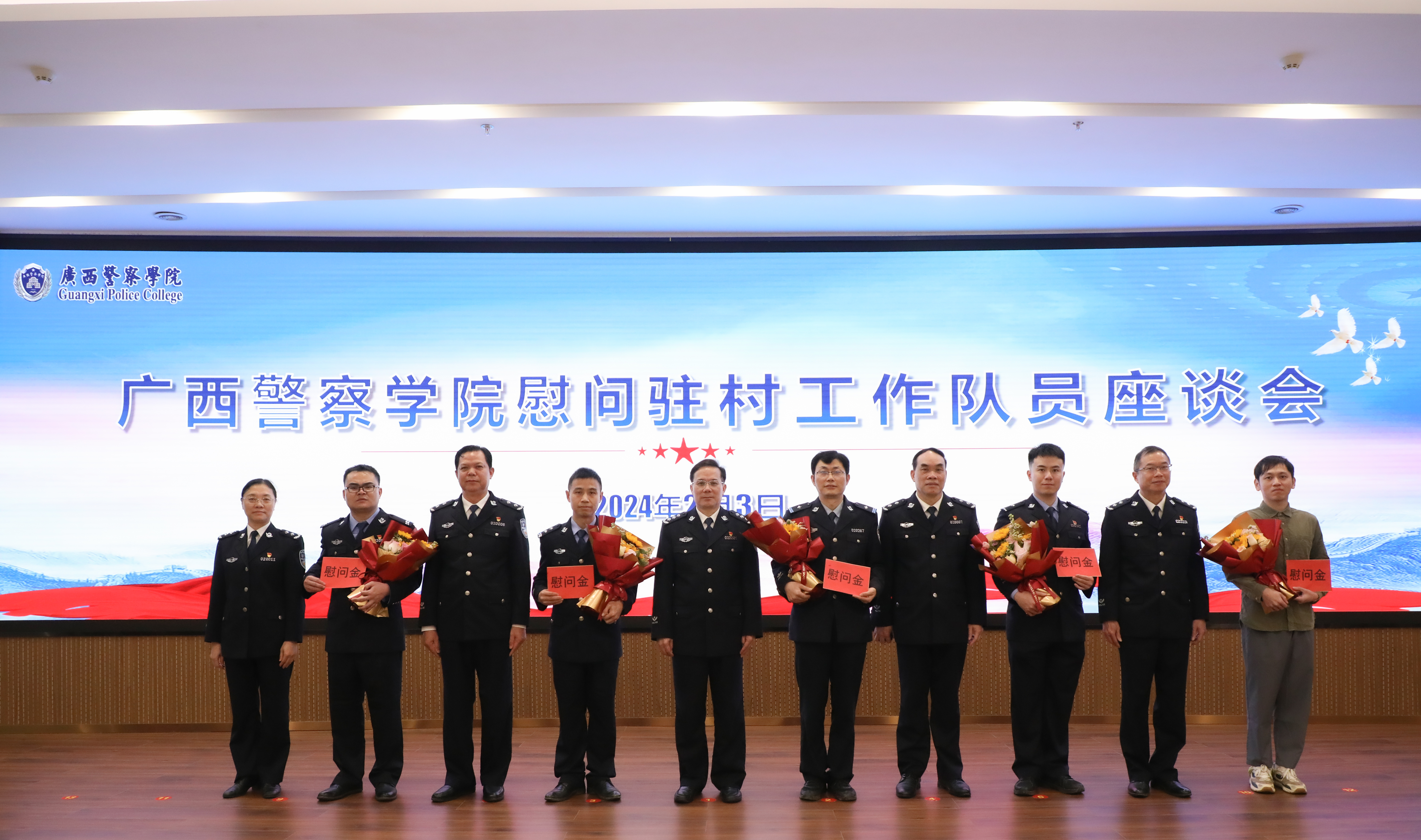 2月3日,学校在仙葫校区公安研训基地召开驻村干部慰问座谈会,校领导覃干超、李克、陈恃中、谢鹏、叶露出席会议,驻村干部王鑫明、章志文、蓝国墉、黄雷文、杨洋,学校驻村干部派出单位党组织负责人参加会议。参会的驻村第一书记、工作队员分别汇报了驻村一年来抓班子、强党建、促致富、惠民生等方面的工作情况。学校党委书记覃干超对第一书记、工作队员们全身心投入乡村振兴工作并取得良好成绩给予了充分肯定,并代表学校党委向全体工作在乡村振兴工作一线的同志们表示诚挚的祝福和美好的祝愿。覃干超要求学校驻村第一书记和工作队员们提高政治站位、强化责任意识、严格遵守纪律,深入学习贯彻习近平总书记关于“三农”工作的重要论述和对广西重大方略要求,认真落实中央和自治区关于乡村振兴工作各项决策部署,充分发扬人民警察特别能吃苦特别能战斗的优良作风,以实际行动展现警院帮扶干部良好的精神风貌,扎实推进乡村振兴各项工作,推动群众持续受益、村庄更好发展,驻村工作结出更加丰硕的果实。