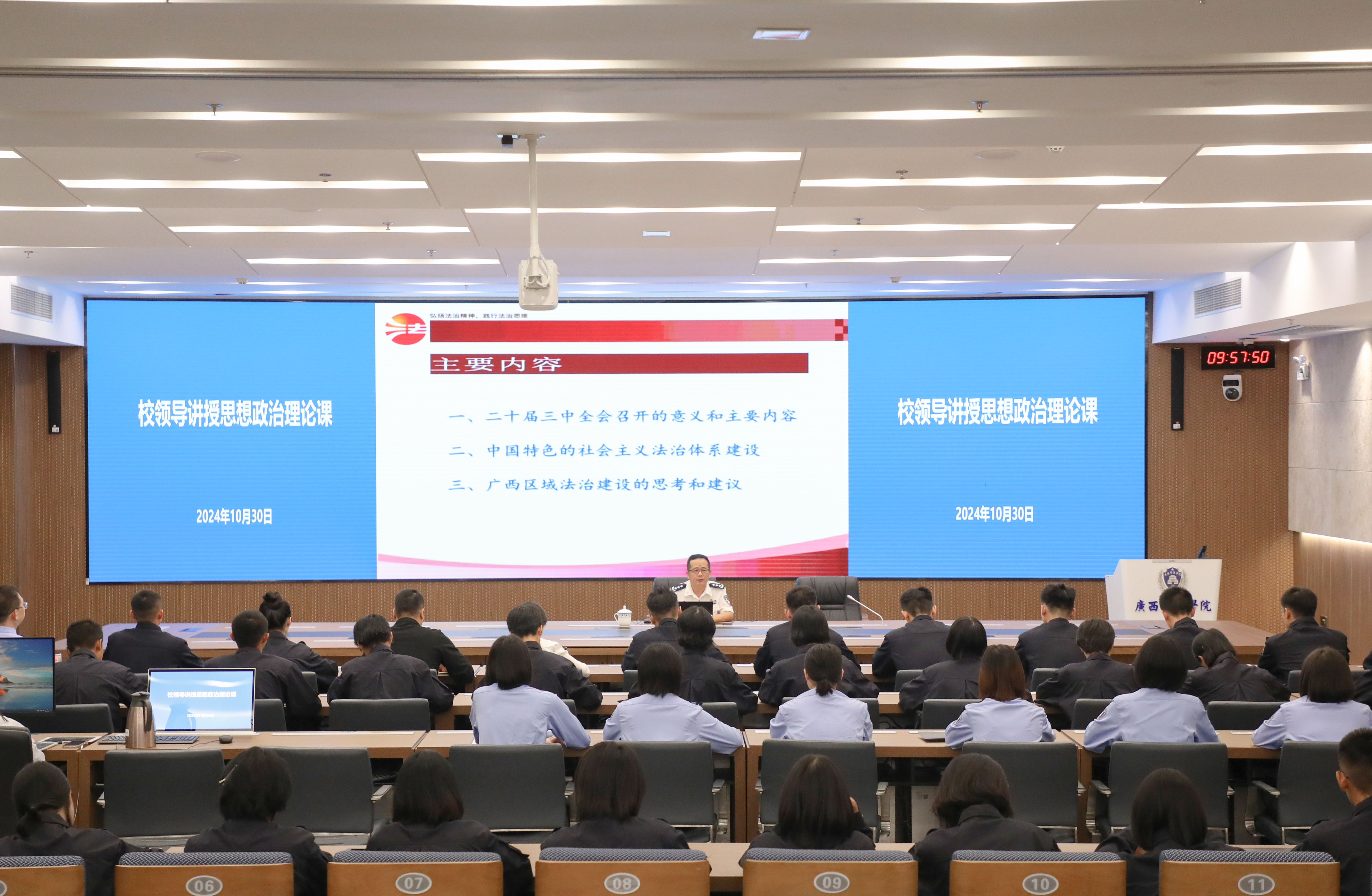 张军以《深入贯彻落实党的二十届三中全会精神 完善中国特色社会主义法治体系》为题,从党的二十届三中全会召开的意义和主要内容、中国特色社会主义法治体系建设、广西区域法治建设的思考等3个方面,进行了精彩讲授。张军紧密结合广西地方发展实际和同学们的思想学习实际,以丰富详实的案例,解读了部分社会聚焦、同学们普遍关心的法学问题,为同学们的职业生涯规划和专业基础能力提升提供了有益的启发和帮助。
