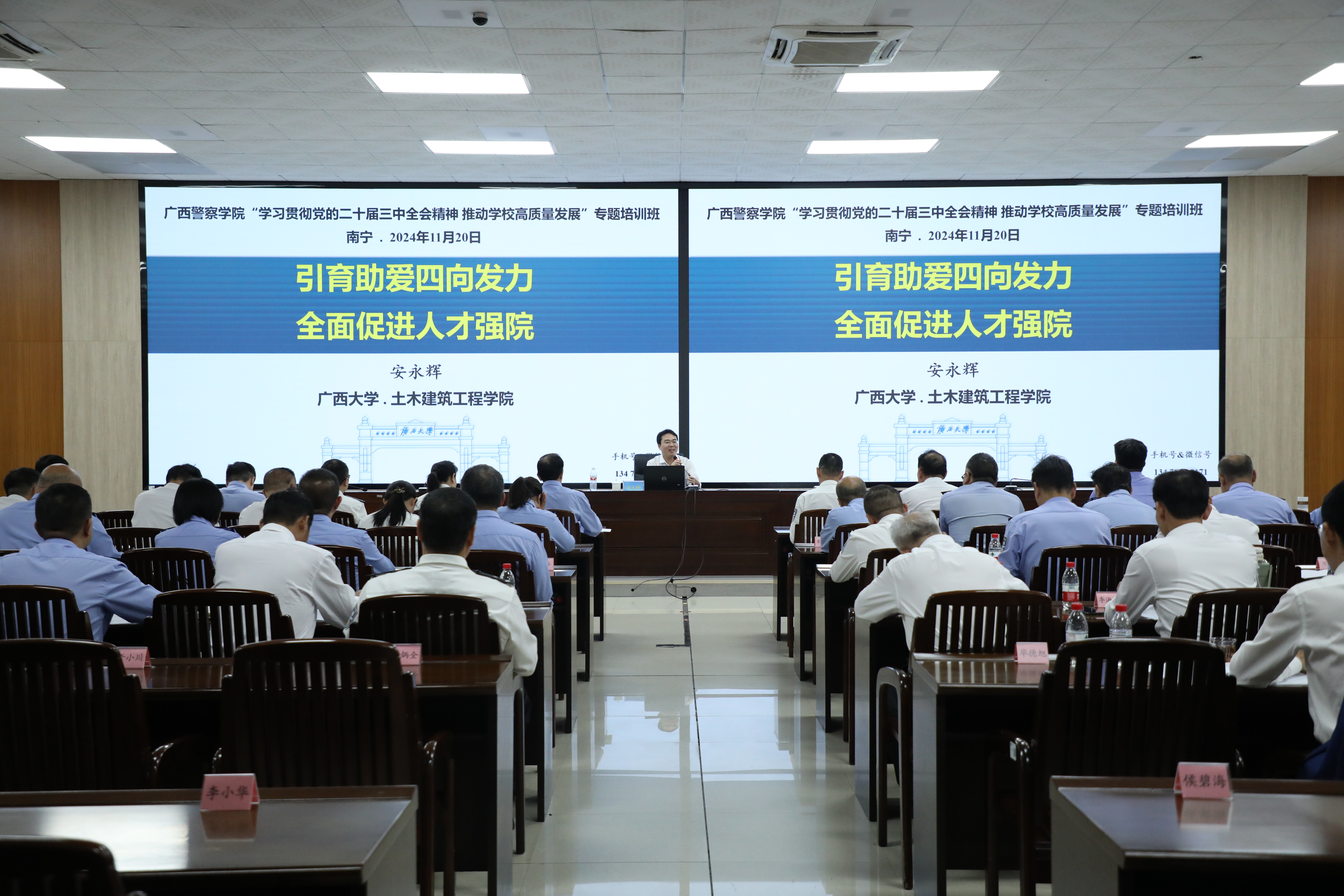 广西大学土木建筑工程学院院长安永辉教授、中共广西区委党校校务委员李波教授、自治区党委网信办网络传播处处长张松涛、浙江大学胡礼祥教授分别围绕学习习近平总书记关于人才工作的重要论述,促进人才强校;贯彻落实习近平总书记关于广西工作论述的重要要求;网络舆情管理与应对;大力弘扬教育家精神,推动“三全育人”等方面作专题辅导报告。