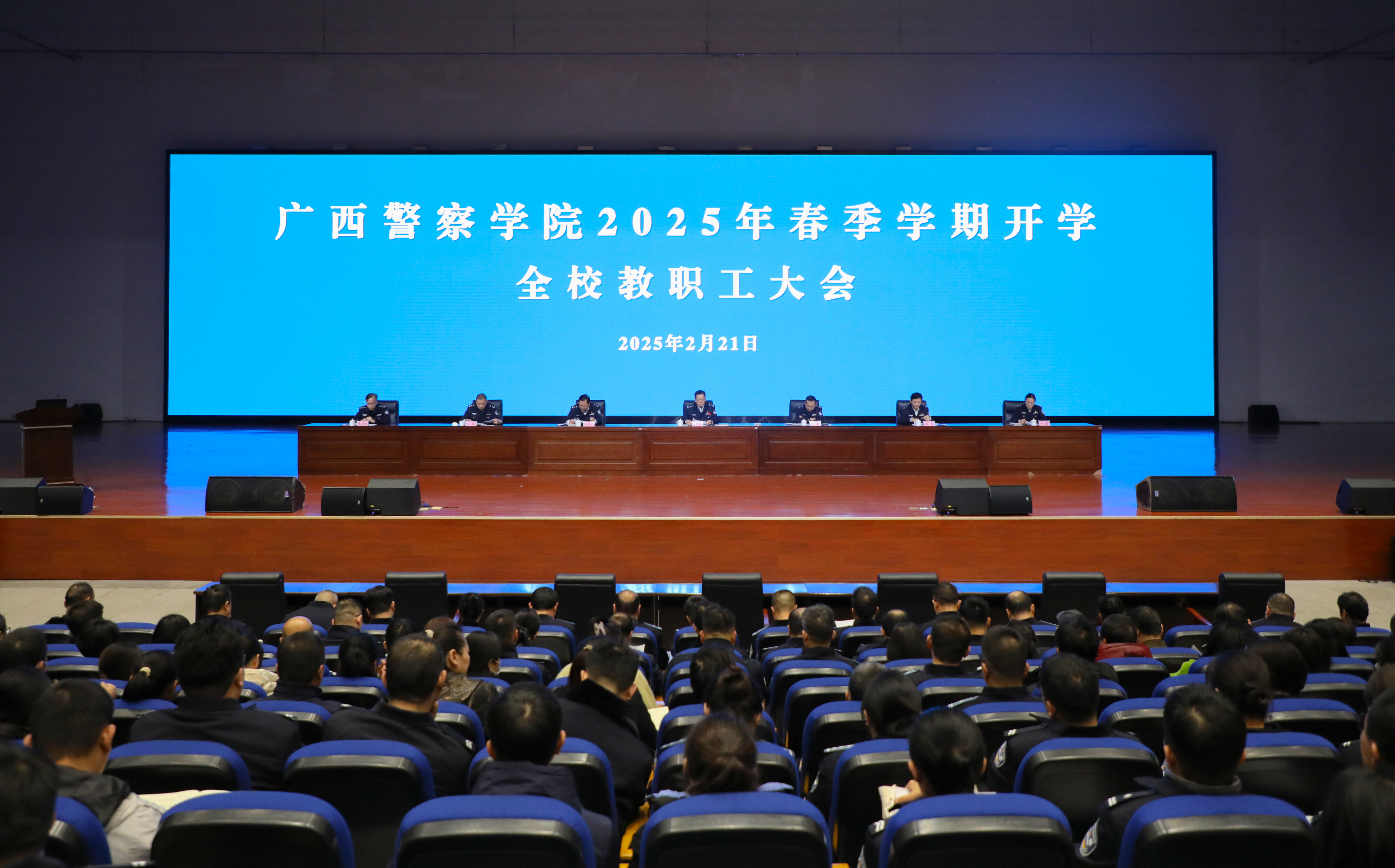 2月21日上午,学校在仙葫校区学术报告中心召开2025年春季学期开学教职工大会,学习贯彻全国、全区教育大会精神,中央、自治区党委政法工作会议精神和全国公安厅局长会议、全区公安局长会议精神,总结2024年工作,分析当前形势,研究部署2025年工作。学校党委书记彭顺克出席会议并讲话。学校党委副书记、校长张军,校党委委员、副校长陈恃中,自治区纪委监委驻学校纪检监察组组长、校党委委员、纪委书记黎东,校党委委员、副校长谢鹏,校党委委员、总会计师叶露,副校长李兴林出席会议。会议由张军主持。