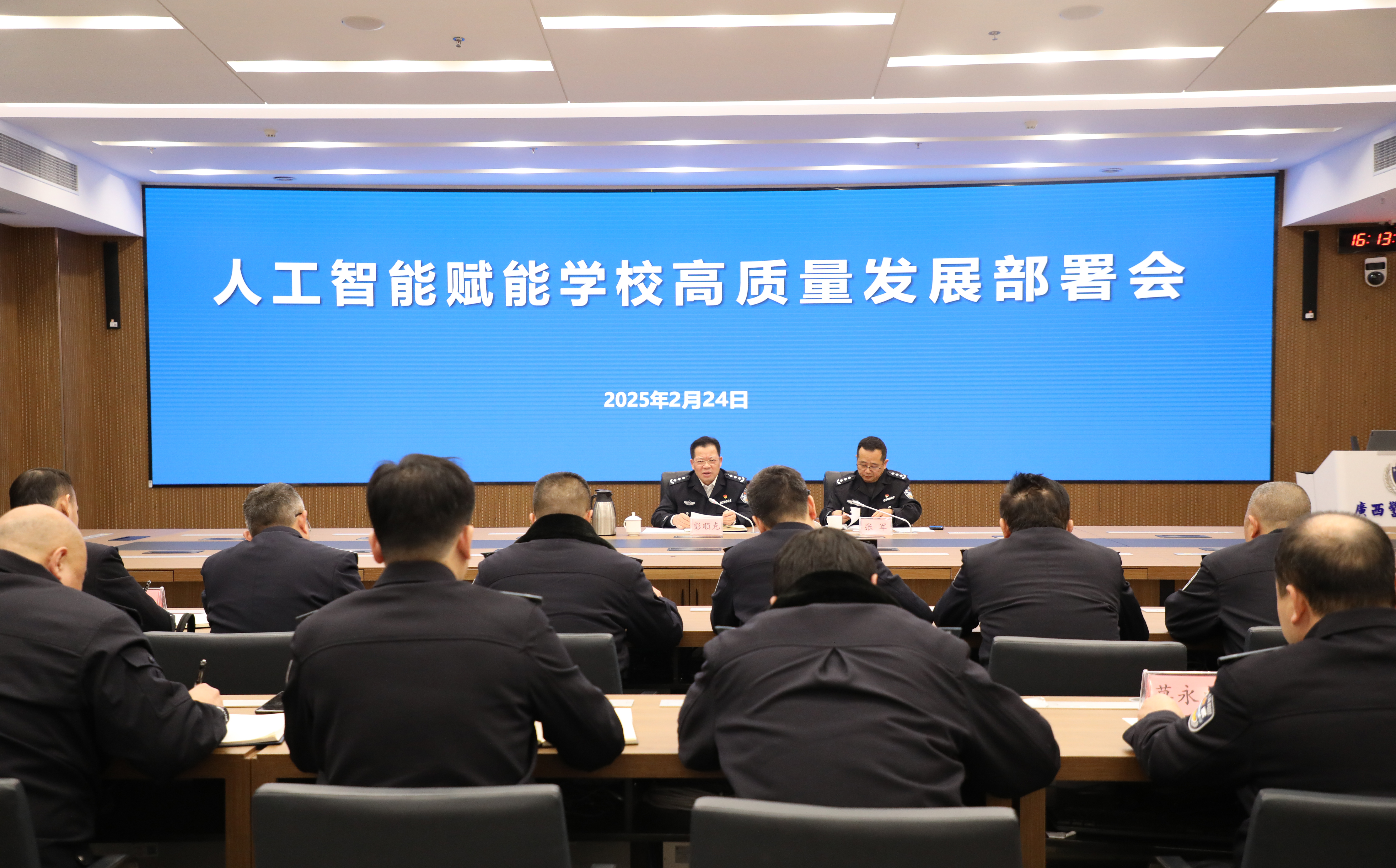 2月24日,beat365在仙葫校区智慧公安研训基地召开人工智能赋能学校高质量发展部署会,贯彻落实自治区党委“以‘人工智能+’赋能千行百业”要求,贯彻自治区党委教育工委、自治区公安厅党委相关要求,捕捉高质量发展机会,加快推进学校数字化建设。学校党委书记彭顺克出席会议并讲话。校长张军主持会议。