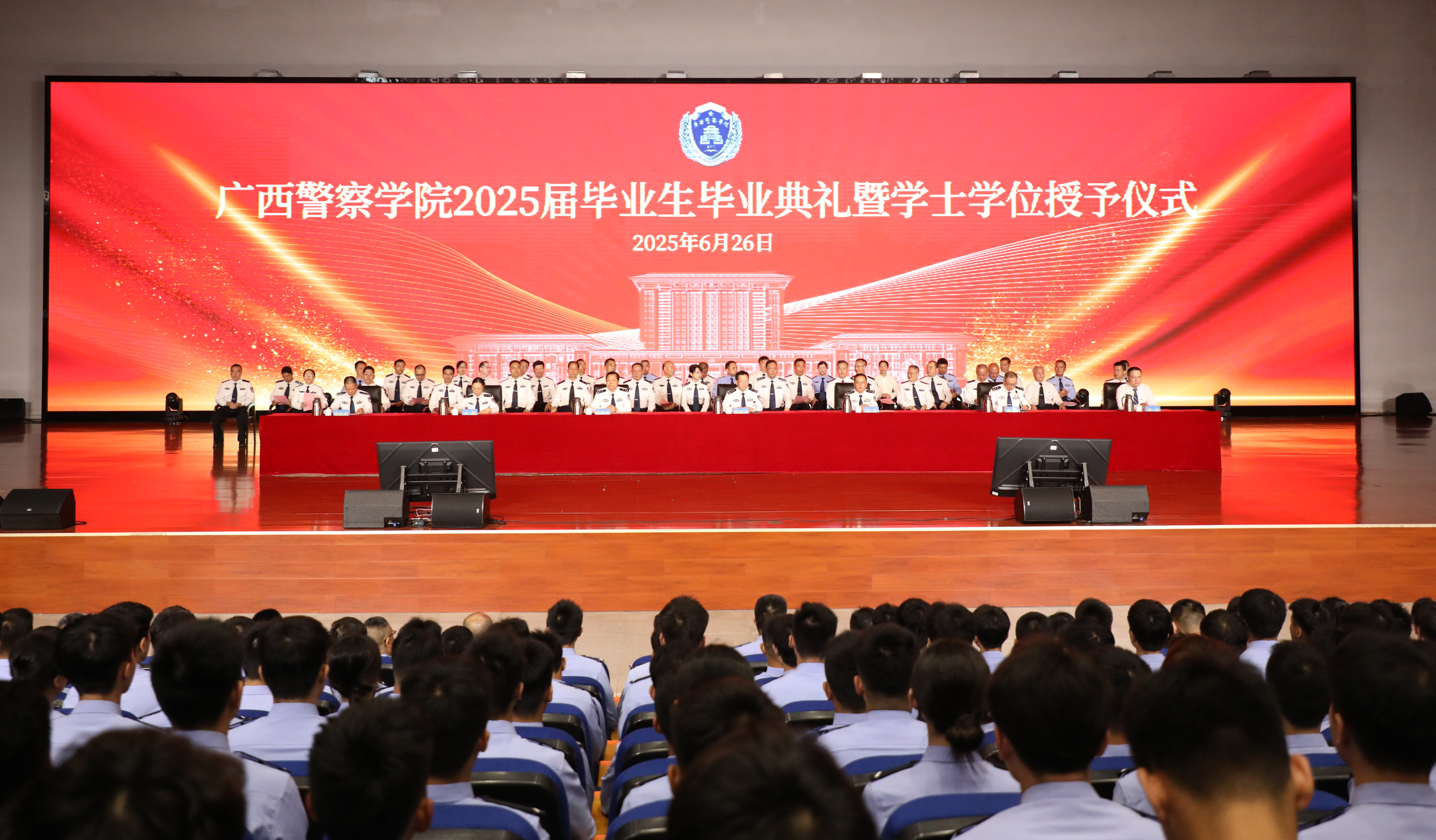风华学子,驭梦远航。6月26日,学校在仙葫校区学术报告中心举行2025届毕业生毕业典礼暨学士学位授予仪式,共同见证2025届3717名警院学子圆满完成学业、开启新征程。学校党委书记彭顺克,学校党委副书记、校长张军,学校党委委员、副校长陈恃中,学校党委委员、副校长谢鹏,学校党委委员、总会计师叶露,副校长蒋超,学校党委委员、副校长唐魁彪出席仪式,谢鹏主持仪式。