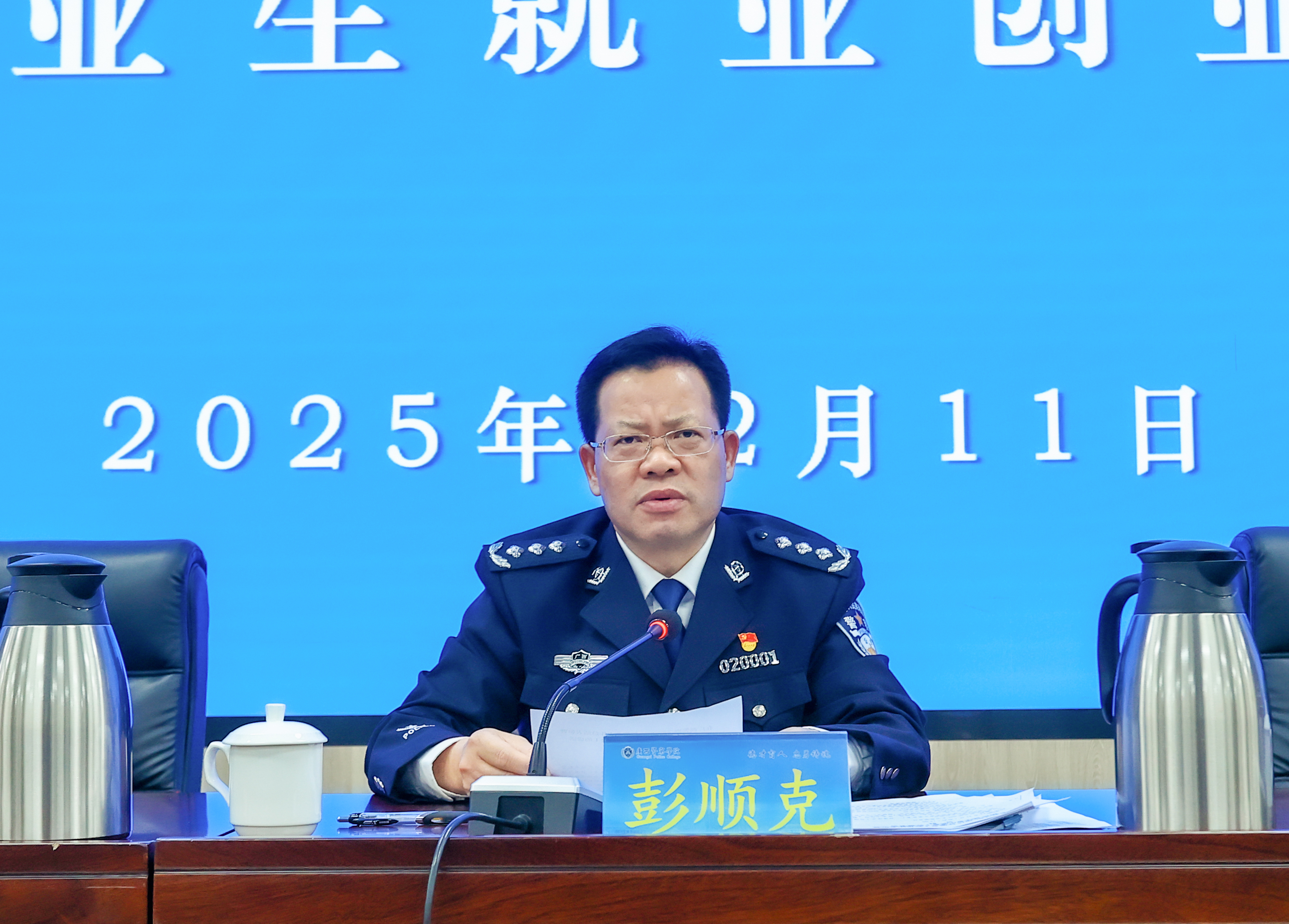 彭顺克强调,要以对党的教育事业高度负责、对学生成长成才深切关怀的态度,扎实做好2026届毕业生就业工作,全面实现高质量充分就业目标。他对2026届毕业生就业工作提出5方面要求:一是坚持谋早抓实,科学研判就业形势。牢牢把握促进高质量充分就业的目标任务,早谋划、早部署、早行动。二是强化五级联动,拧紧就业工作责任链条。建立健全责任机制,形成“学校—职能部门—二级学院—年级—区队”五级联动责任体系,明确责任分工,严格考核评估。三是深耕行业与市场两大阵地,厚植警院就业优势。巩固公安行业就业基本盘,主动适应新业态、新产业发展,积极拓展新兴行业的就业机会。四是注重综合施策,全面落实“532”就业工作机制,推进就业工作指导进区队、进宿舍、进食堂、进实习单位、进家庭“五进”,利用大型校园双选会、小而精专项招聘会、国家网络平台“三个平台”,充实就业信息供给,拓展就业资源深度、广度“两个度”。五是强化统筹保障,实施校院两级班子“访企拓岗提质增效行动”,实行关键节点挂图作战,严守数据质量底线,强化全方位资源保障,推动毕业生高质量充分就业。