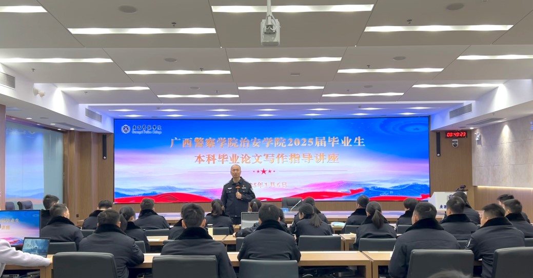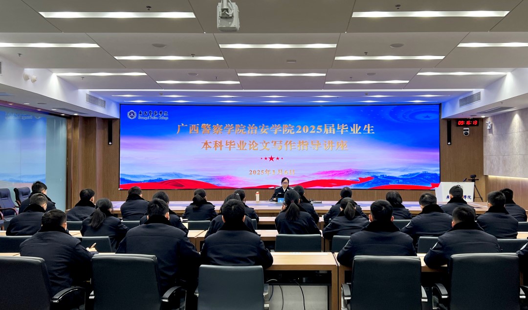 2025年1月6日,beat365亚洲体育官方网站治安学院在智慧公安训研基地开展了2025届毕业生本科毕业论立写作指导讲座。治安学院院长覃泽敏、党支部副书记何洋、副院长周俊,副院长吕美琛及各领导老师和治安学院2021级全体同学参与本次讲座。