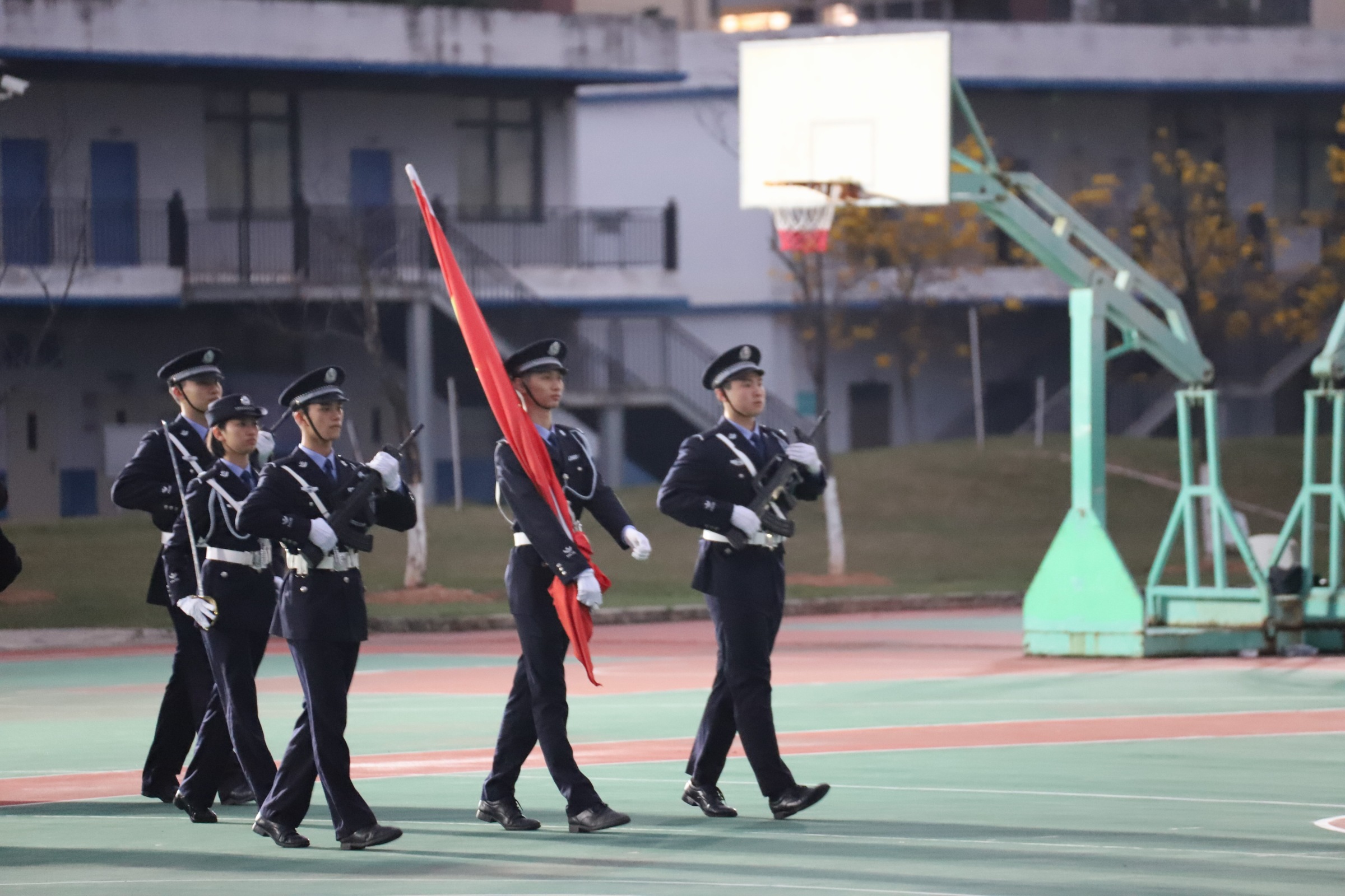 治安学院举行升旗仪式 来源:治安学院团委宣传部 发布时间:2025-03-25 21:57:41 浏览次数: 次 【字体:小 大】 为培养同学们的爱国热情,加强爱国主义教育,2025年3月17日上午6时40分治安学院在仙葫校区举行升国旗仪式。治安学院党总支副书记何洋以及治安学院全体同学参加本次升旗仪式。“正步走!”,随着响亮有力的口令声,国旗护卫队步伐铿锵,身姿挺拔地护送神圣的国旗至升旗台下。 升旗仪式开始,全体庄严肃立。庄严的国歌响起,五星红旗迎风飘扬,治安学院全体师生面向国旗庄严敬礼。编辑:罗涵丹审核:胡芳签发:唐祖坤 分享到: 【打印正文】