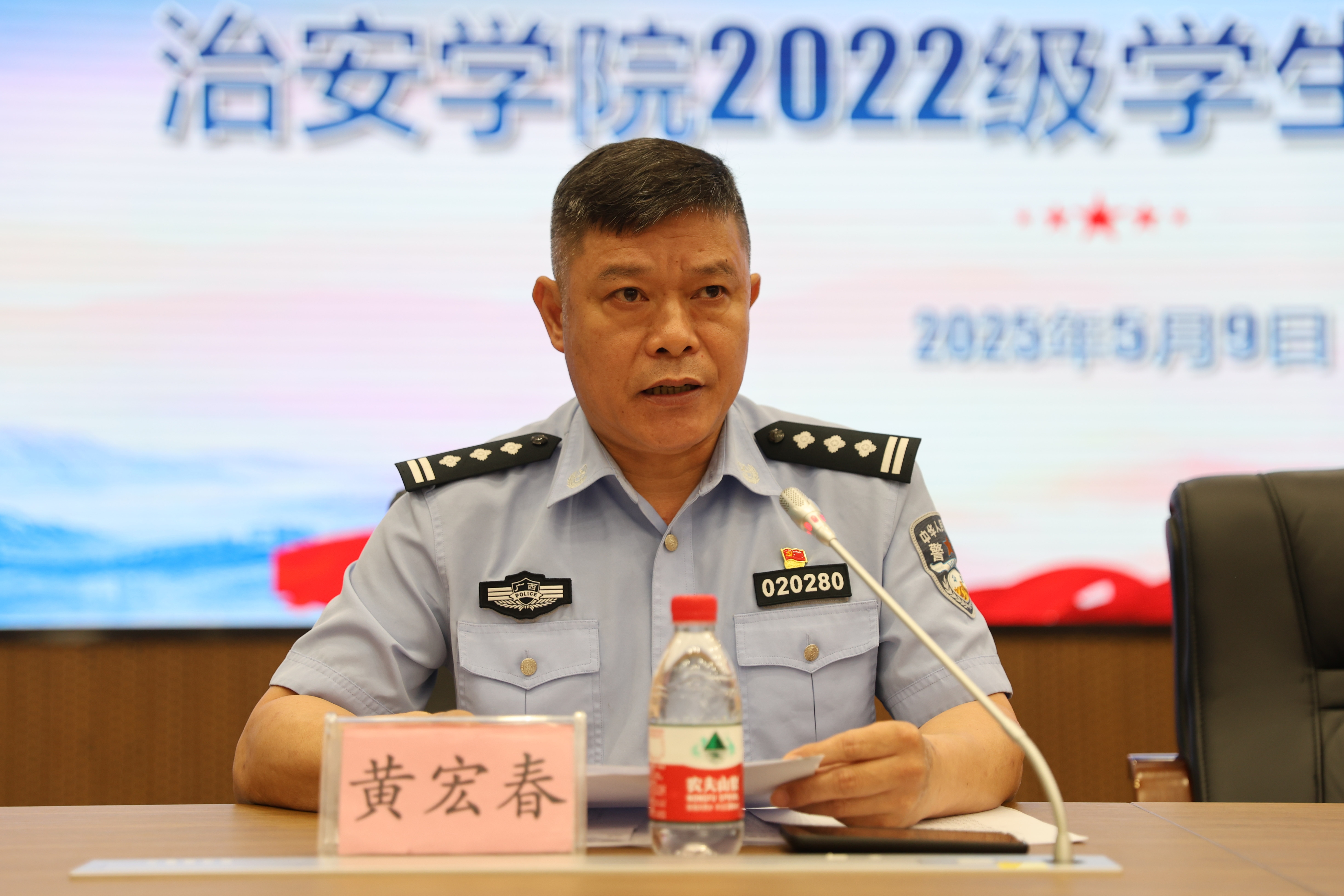 黄宏春队长宣布实习名单和实习安排,从三个方面表达了对同学们的期望:一、务必保持正确的政治方向和政治立场。二、务必以公安机关的标准要求自己。三、务必做到一切行动听指挥。