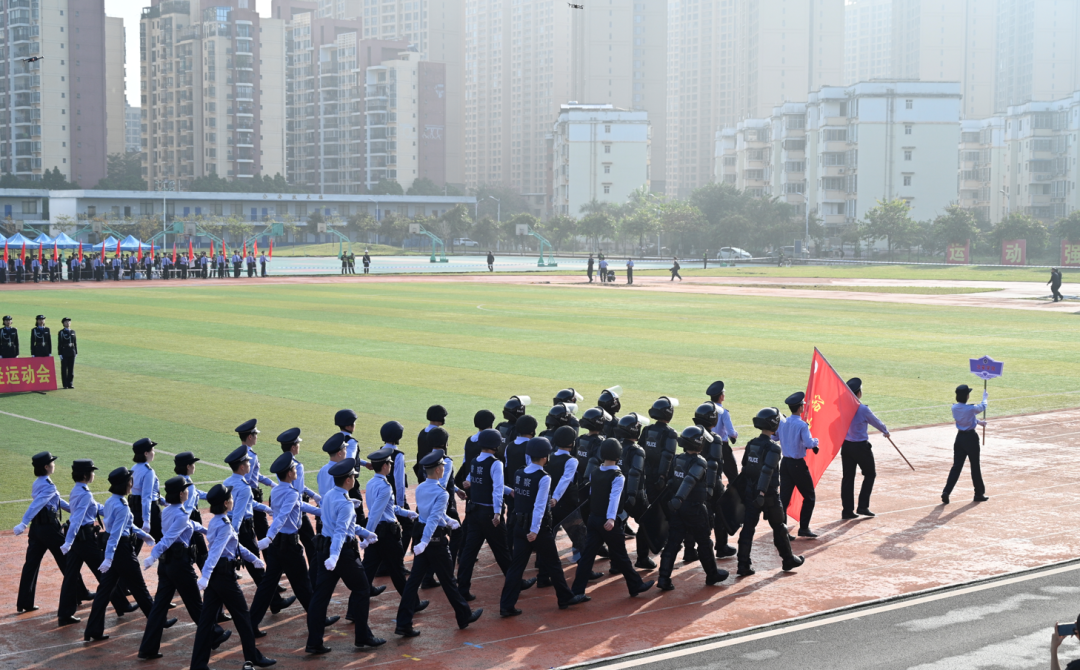 伴随着分列式进行曲,治安学院方阵队员们身着制式长袖衬衣,每一位队员都充分展现着治安学子敢于拼搏的精神风貌,“治安飞扬,气宇轩昂,同心协力,铸就辉煌”的口号响彻云霄。