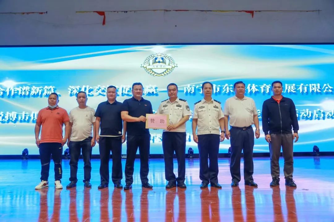 接着由覃泽敏院长代表治安学院全体师生对南宁市东港体育发展有限公司和广西翔锐搏击俱乐部的赞助和支持表示衷心的感谢,并对于企业代表的到来表示热烈的欢迎。覃泽敏院长对后续合作提出了三点要求:一是希望全体同学都能够以实现德、智、体、美、劳全面发展为目标;二是要持续推动学院警务技能训练、提升学生警务实战水平;三要积极提高散打技能,培养坚毅勇敢、敢于拼搏的优良品质和精神面貌。
