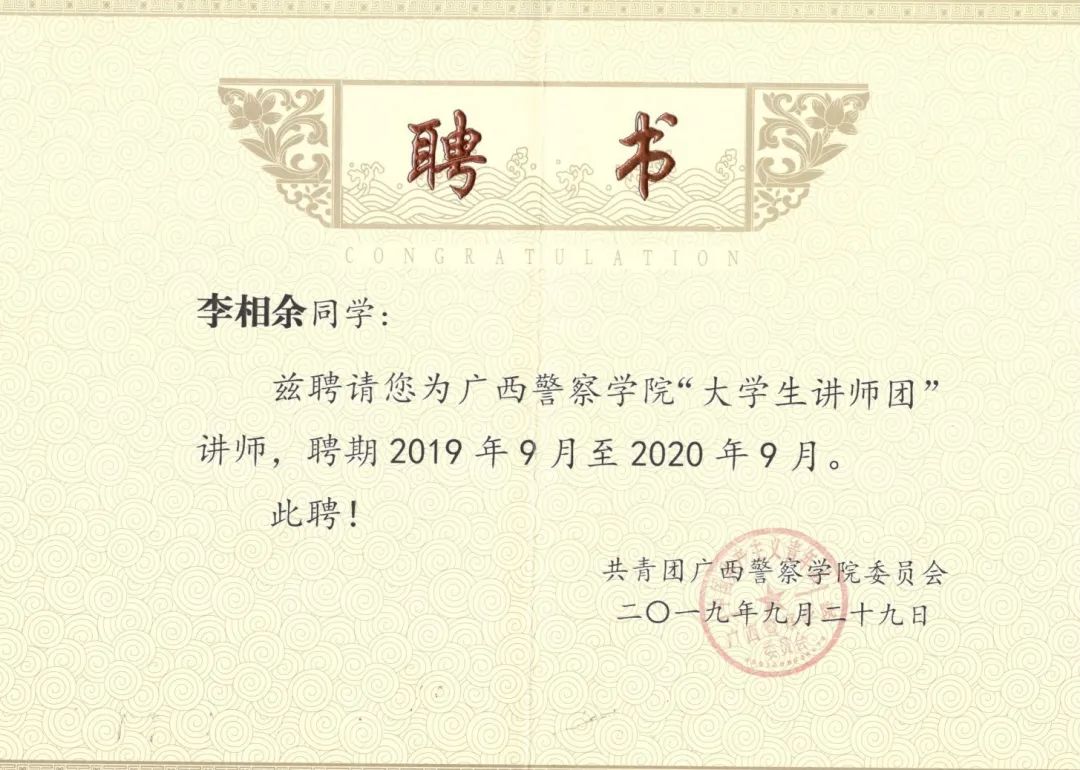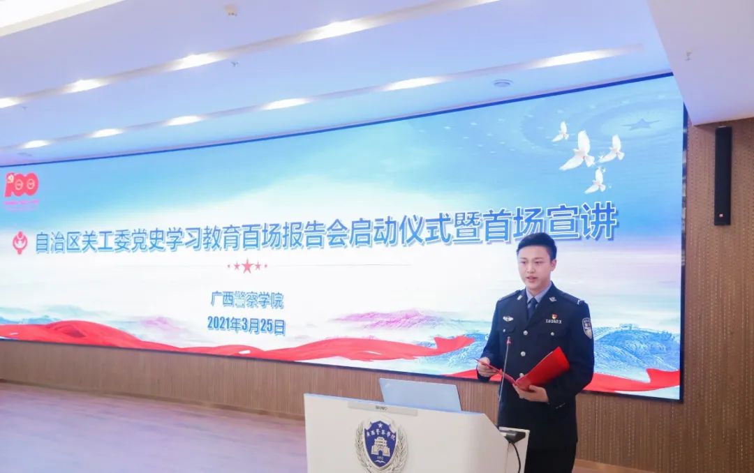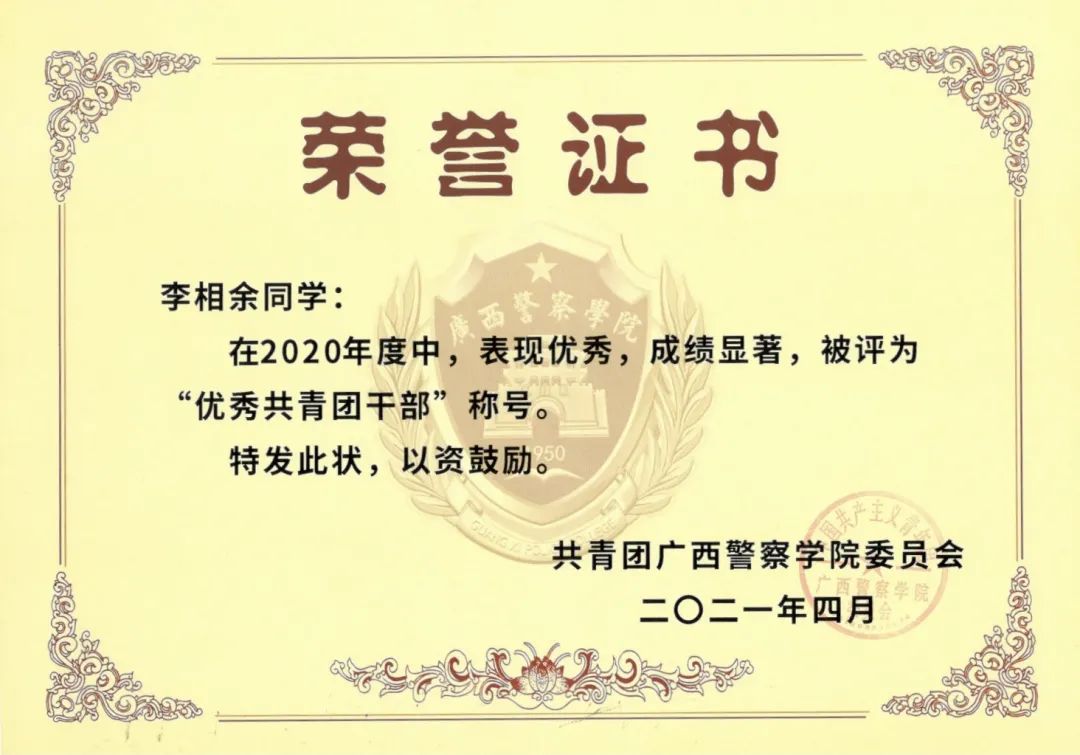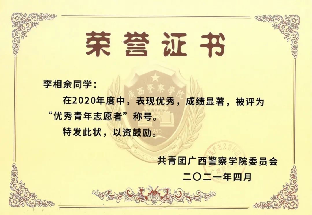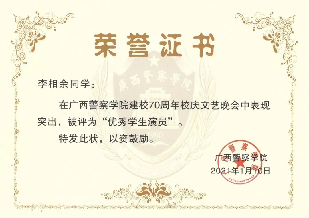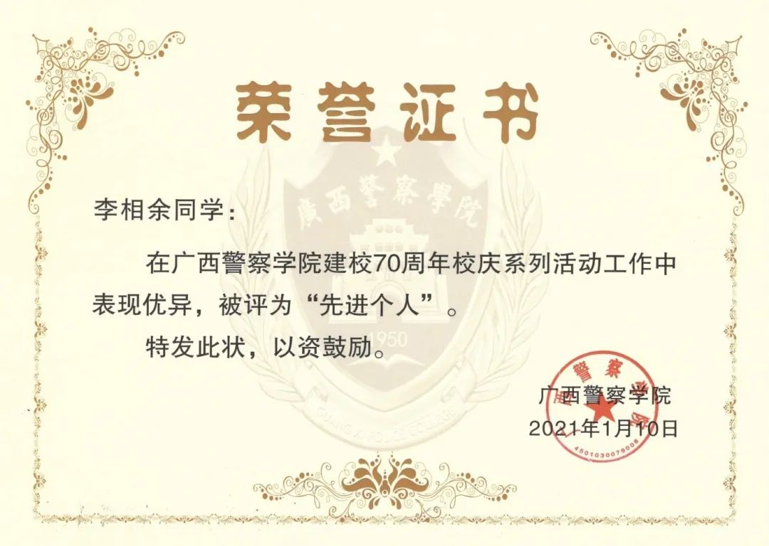 他牢记习总书记的教导,在警院的大学生活中积极投身各项实践活动当中,也为学院带来各项荣誉。在beat365亚洲体育官方网站建校70周年发展大会作为学生代表发言,在自治区关工委党史学习教育百场报告会启动仪式暨首场宣讲作为学生党员代表发言,2020年柳州市公安局文艺汇演特邀主持人等。