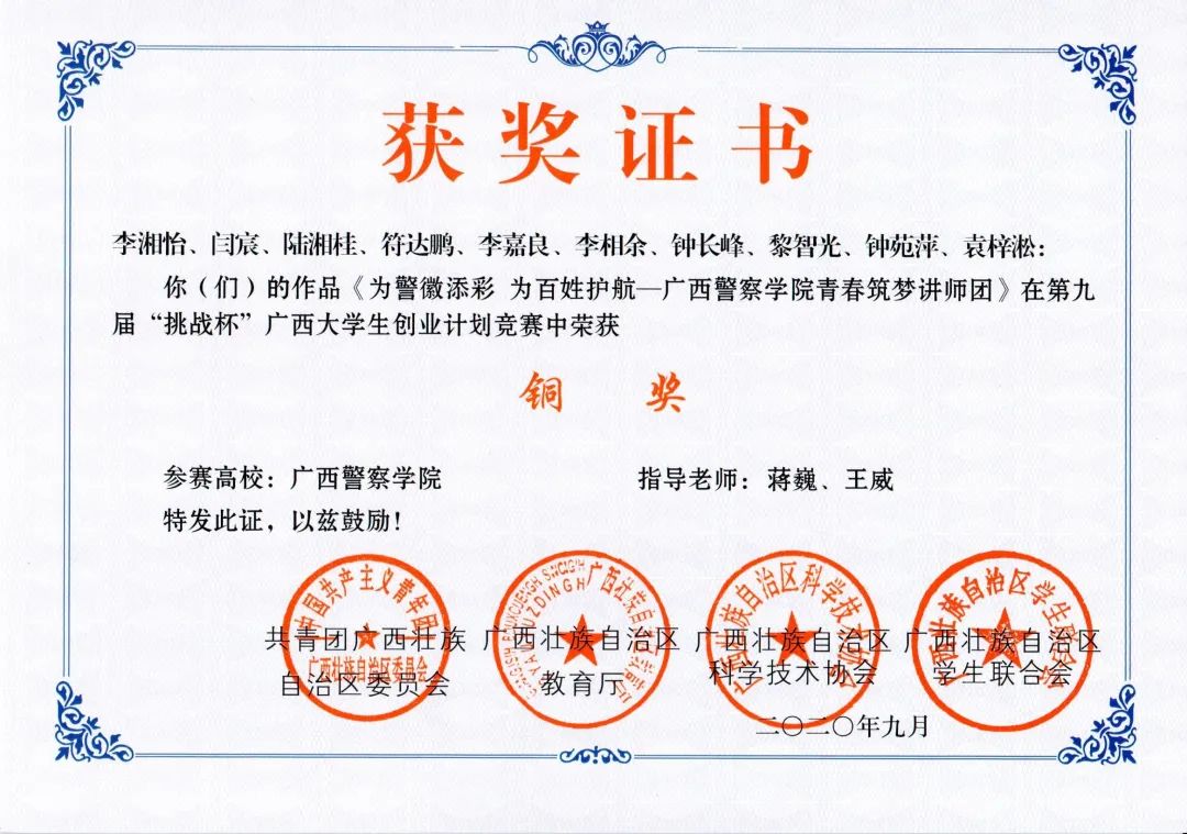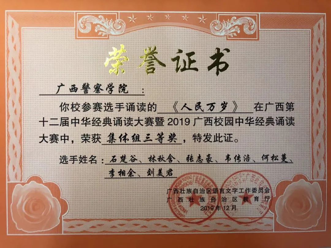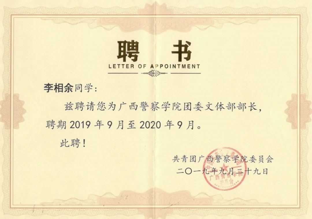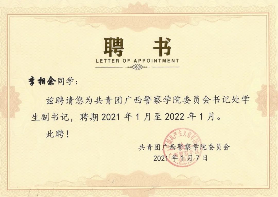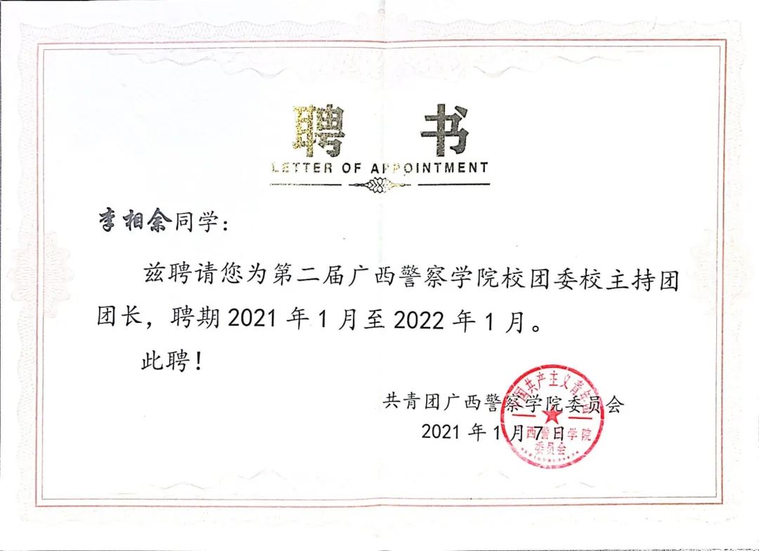 他牢记习总书记的教导,在警院的大学生活中积极投身各项实践活动当中,也为学院带来各项荣誉。在beat365亚洲体育官方网站建校70周年发展大会作为学生代表发言,在自治区关工委党史学习教育百场报告会启动仪式暨首场宣讲作为学生党员代表发言,2020年柳州市公安局文艺汇演特邀主持人等。
