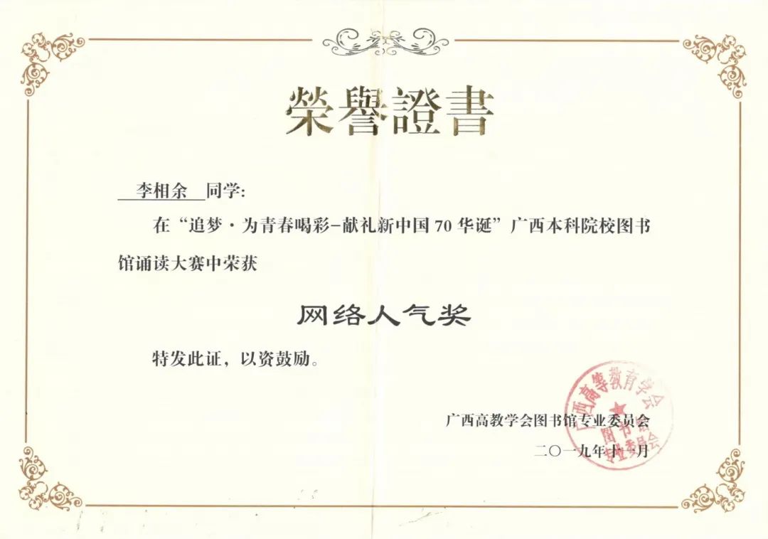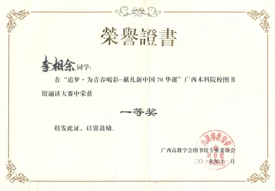 2019年荣获广西本科院校图书馆诵读大赛全区一等奖,2020年在新冠肺炎疫情爆发期间,积极响应,加入柳州市防控疫情志愿者行列,因抗疫工作突出,被广西日报、广西云客户端等相继报道。