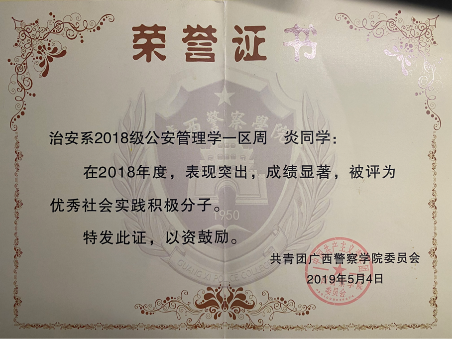 从2018年9月入学以来,他努力学习党的思想,拥护党的政策方针,积极向党组织靠拢,政治面貌由群众到共青团员再到入党积极分子,一步步朝着理想目标前进。他坚持以中共党员的标准要求自己,促使自己成为一名合格的预备警官,继承和发扬警院不怕苦不怕累的优良传统,积极投身于学习生活和各项实践活动当中,也为学院和自己带来各项荣誉。