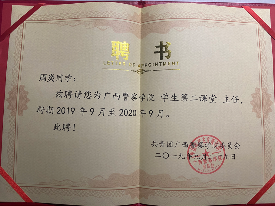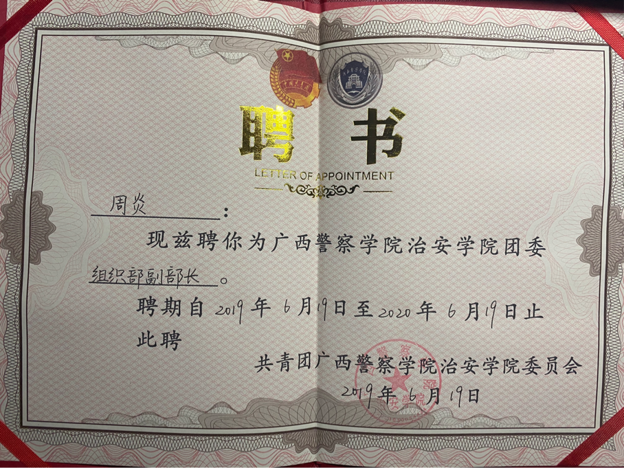 现任校学生会学习部部长、治安学院团委组织部副部长、治安学院讲师团团长