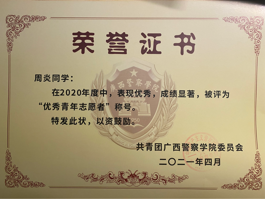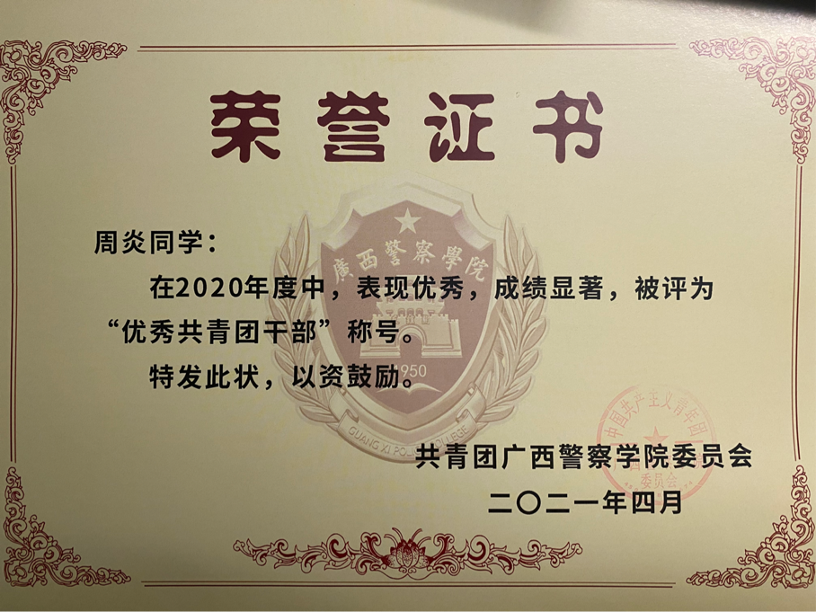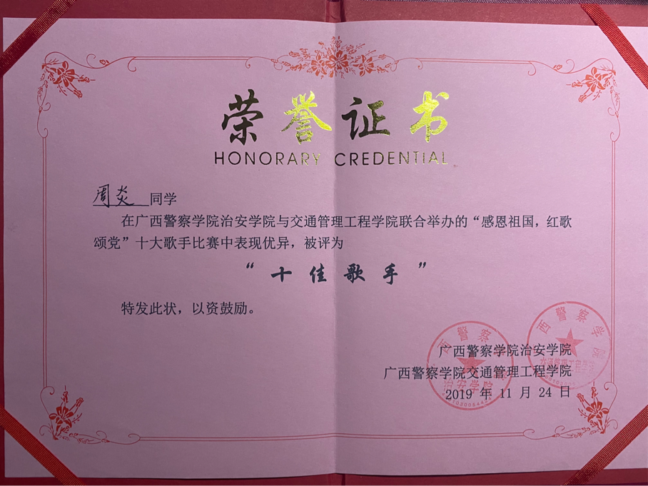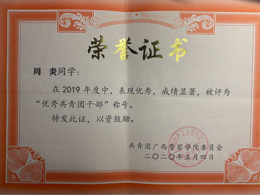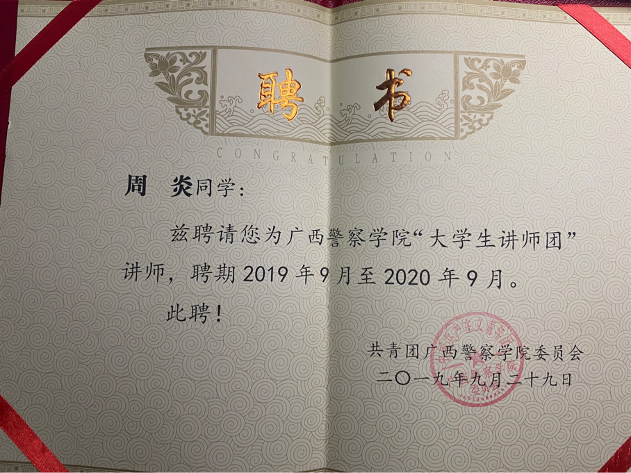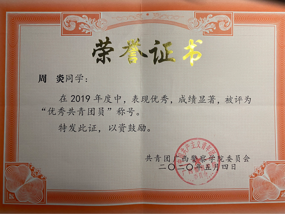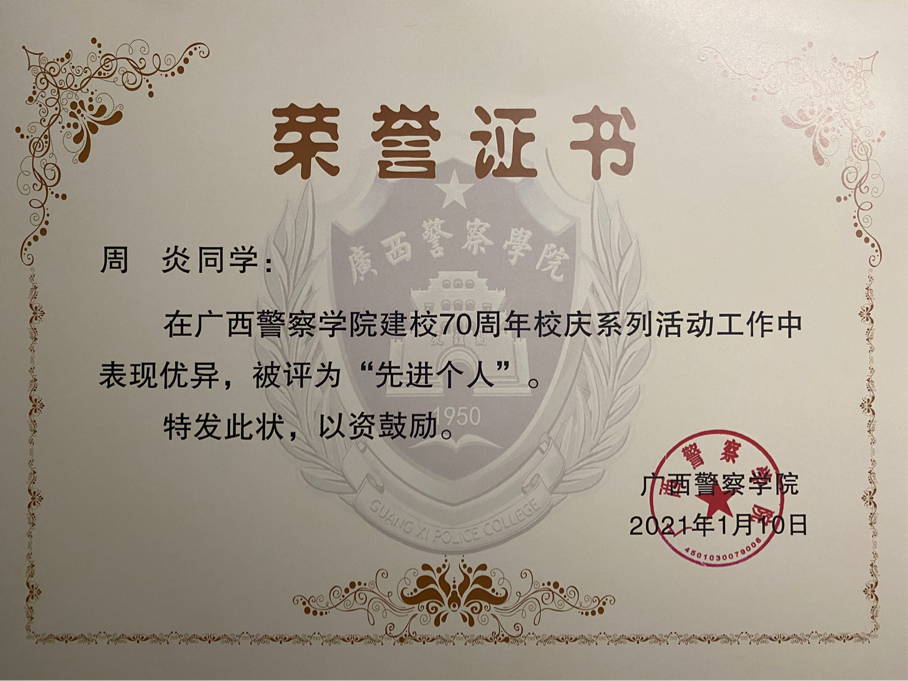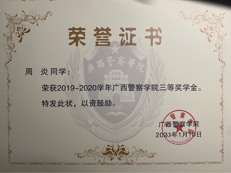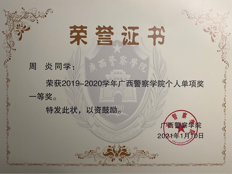 以下为周炎入校以来所获得的部分荣誉情况