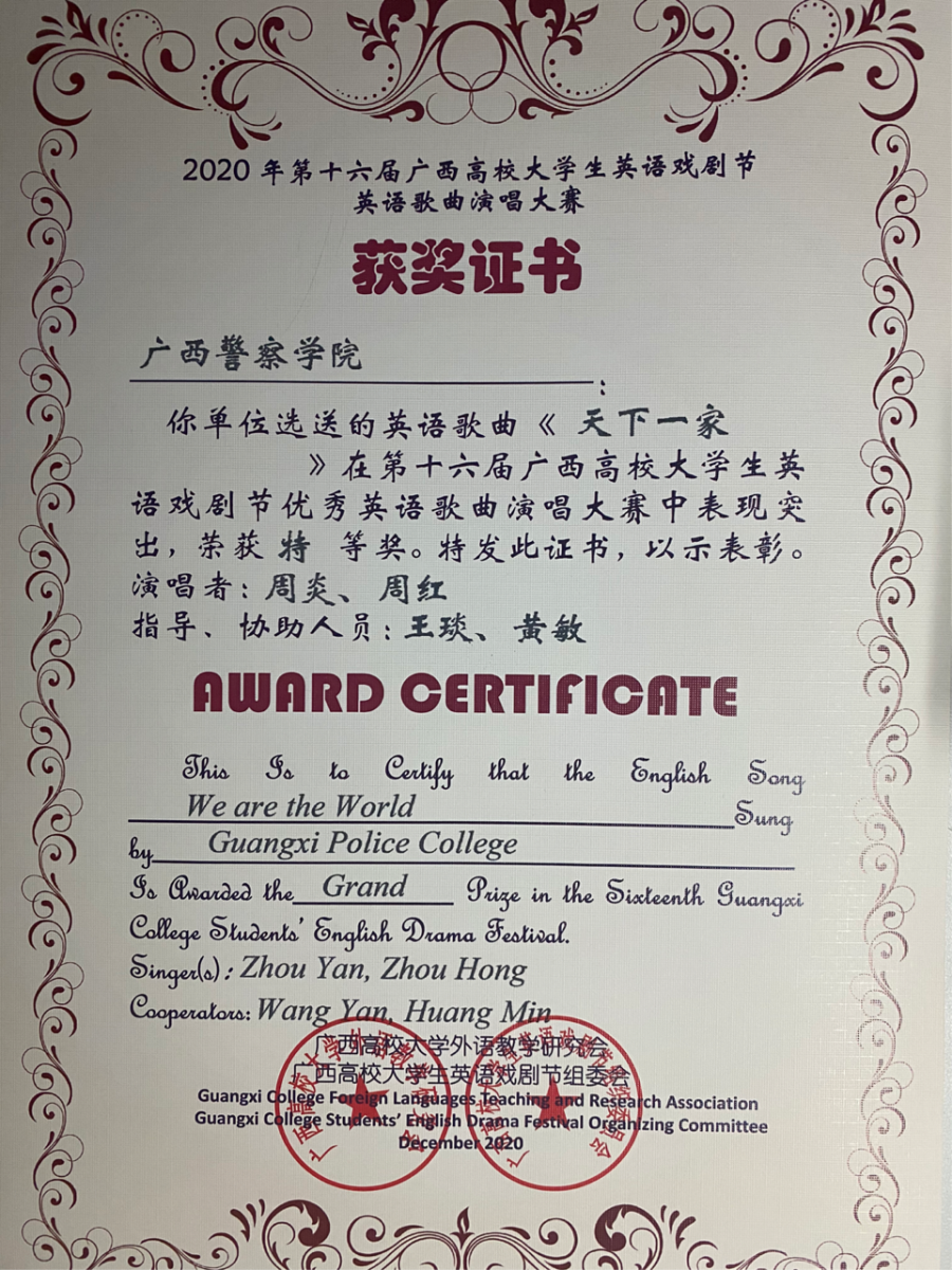 在2019年第一次代表beat365亚洲体育官方网站参加广西高校大学生英语戏剧节优秀英语歌曲演唱大赛,作品《perfect》荣获全区一等奖。2020年以新冠疫情为灵感自导自演MV《we are the world》第二次代表beat365亚洲体育官方网站参加广西高校大学生英语戏剧节优秀英语歌曲演唱大赛再创佳绩,荣获全区特等奖,是beat365参与该比赛以来第一次获得特等奖的作品。