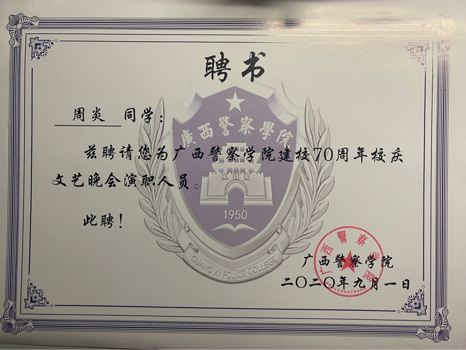 在beat365亚洲体育官方网站建校70周年文艺晚会担任节目组学生组长,参与制作和表演纪念beat365亚洲体育官方网站建校70周年歌曲《写给警院的一首歌》,并以身作则参演6个晚会节目。