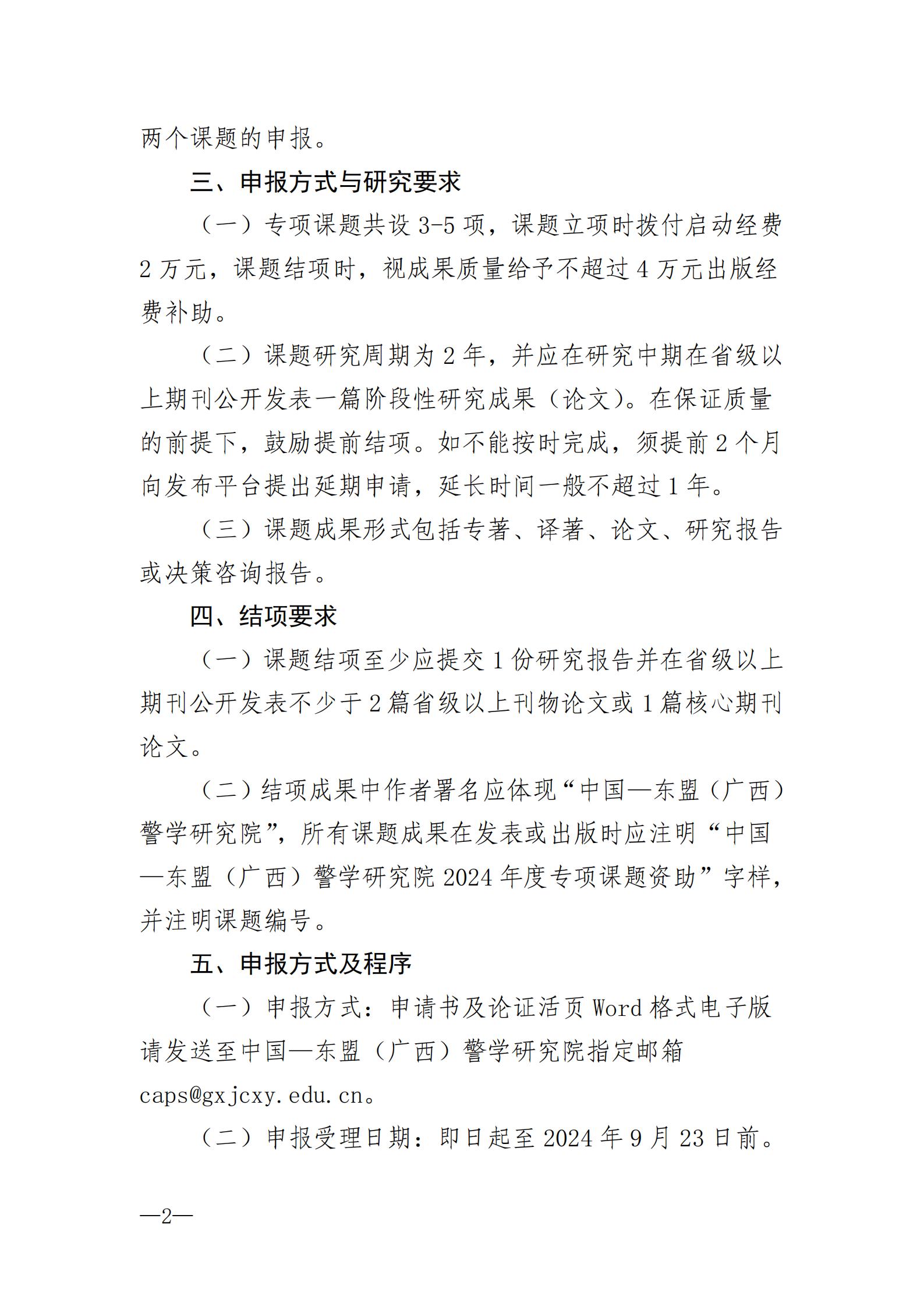 中国—东盟(广西)警学研究院 2024 年度专项课题申报通知 来源: 发布时间:2024-08-24 17:10:00 浏览次数: 次 【字体:小 大】 附件1:2024年度专项课题指南.docx附件2:2024年度专项课题申请书.docx附件3:2024年度专项课题论证活页.docx 分享到: 【打印正文】